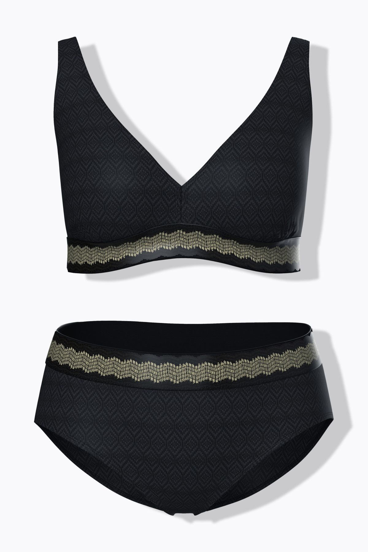 Бански от 2 части със златни акценти. С горнище с оформени чашки без банели, дълбоко V - образно деколте, регулиращи се широки презрамки и задно закопчаване. С долнище тип бикина с подплата. От лека, бързосъхнеща материя.