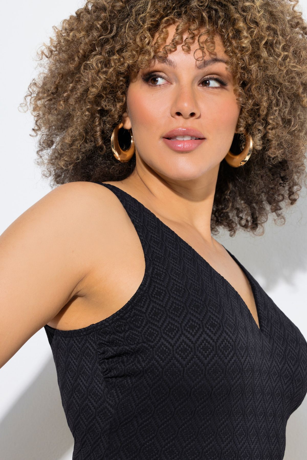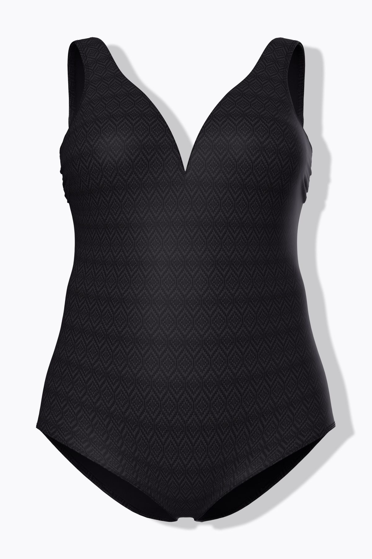 Бански с геометрични акценти на материята. С дълбоко V - образно деколте, широки, комфортни презрамки, оформени чашки без банели с еластична лента под бюста за поддържане. С подплата отпред, от бързосъхнеща материя.