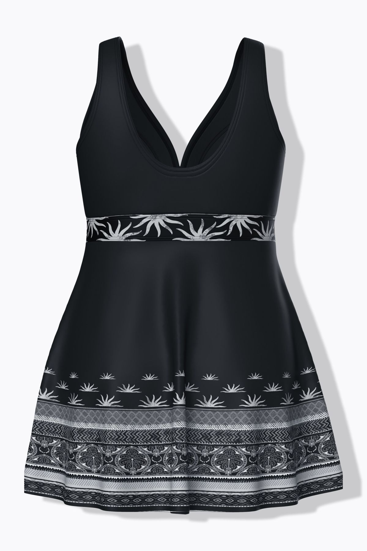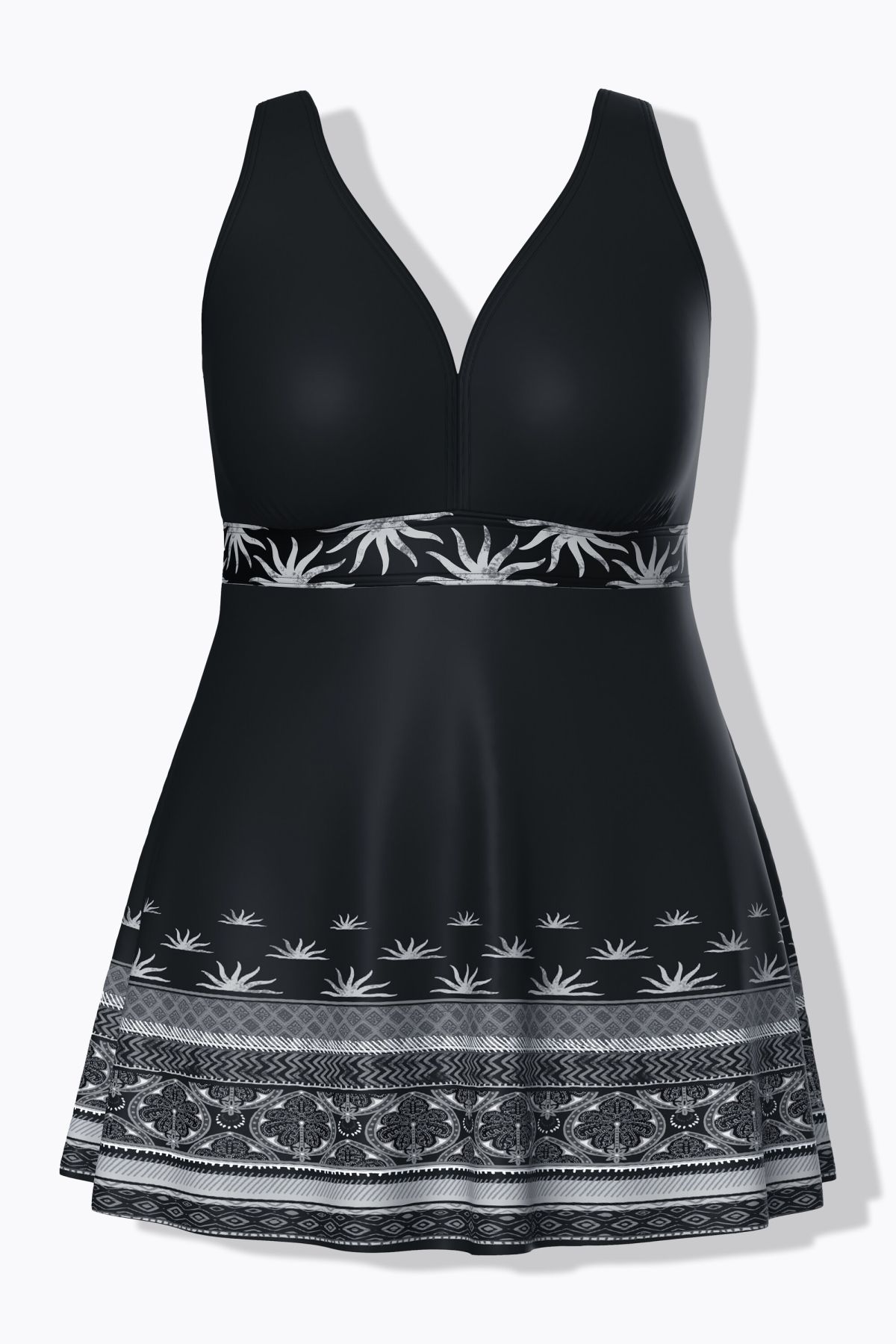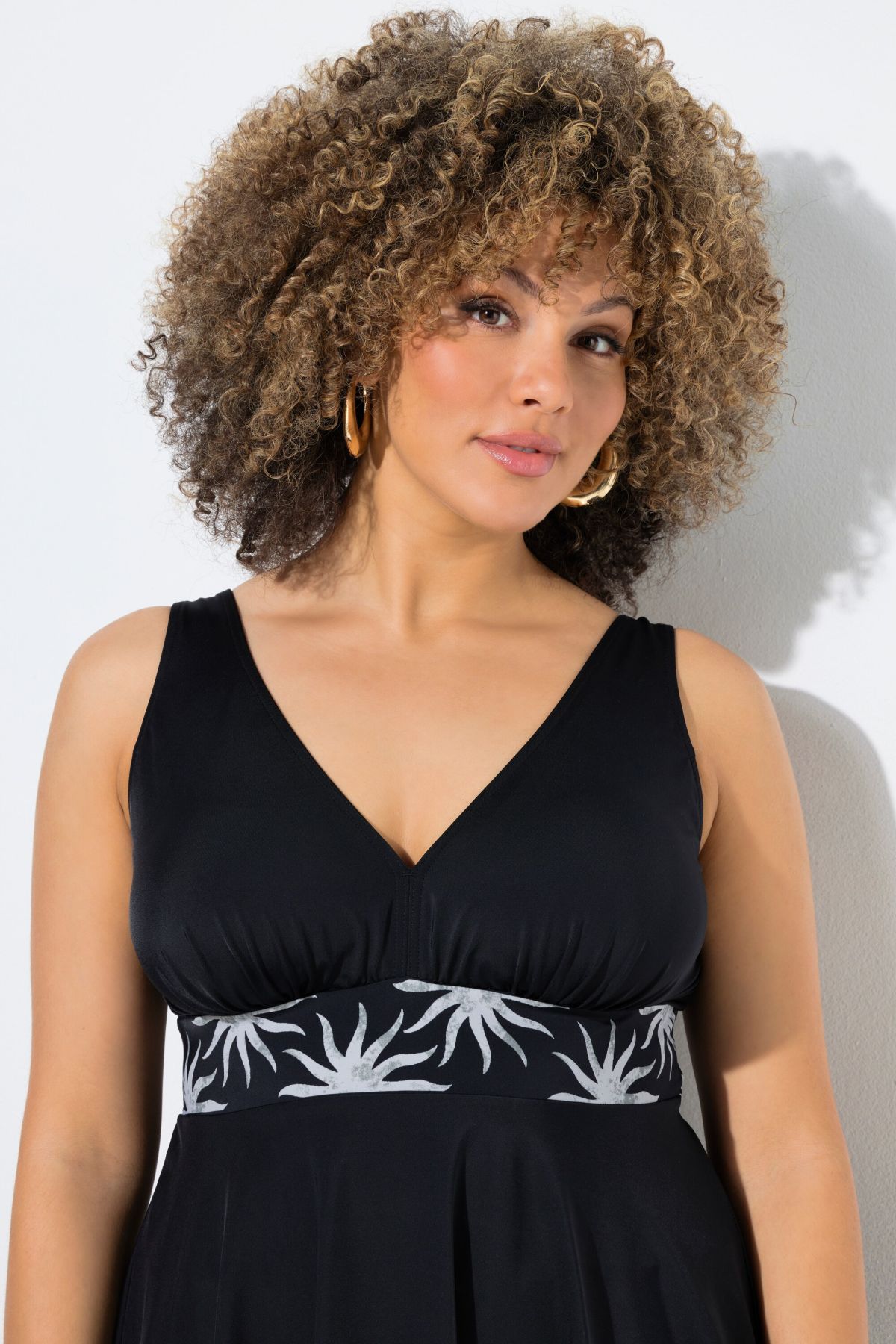 Бански тип рокля с принт на слънца и комфортна А - линия на силуета. С оформени чашки, еластична лента под бюста, широки комфортни презрамки и подплата. От лека, бързосъхнеща материя.