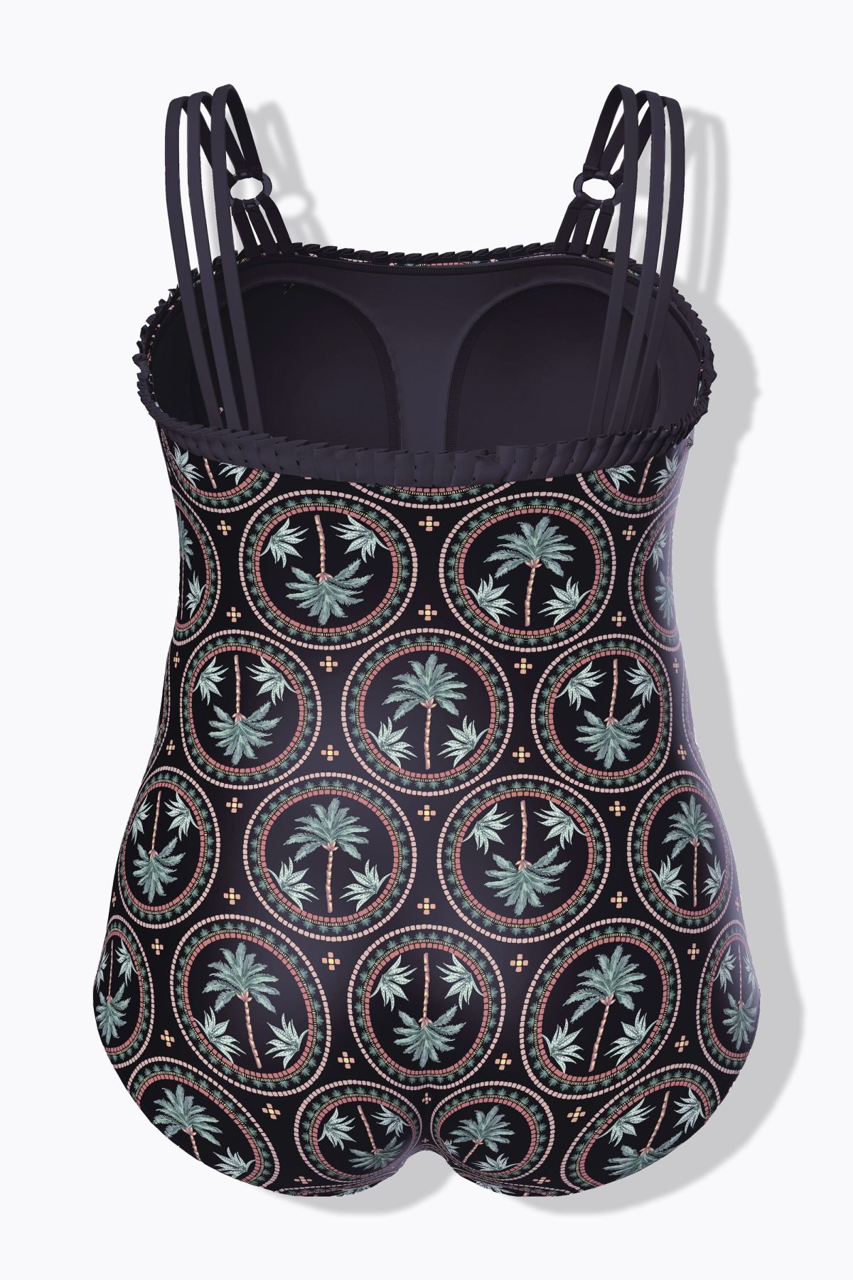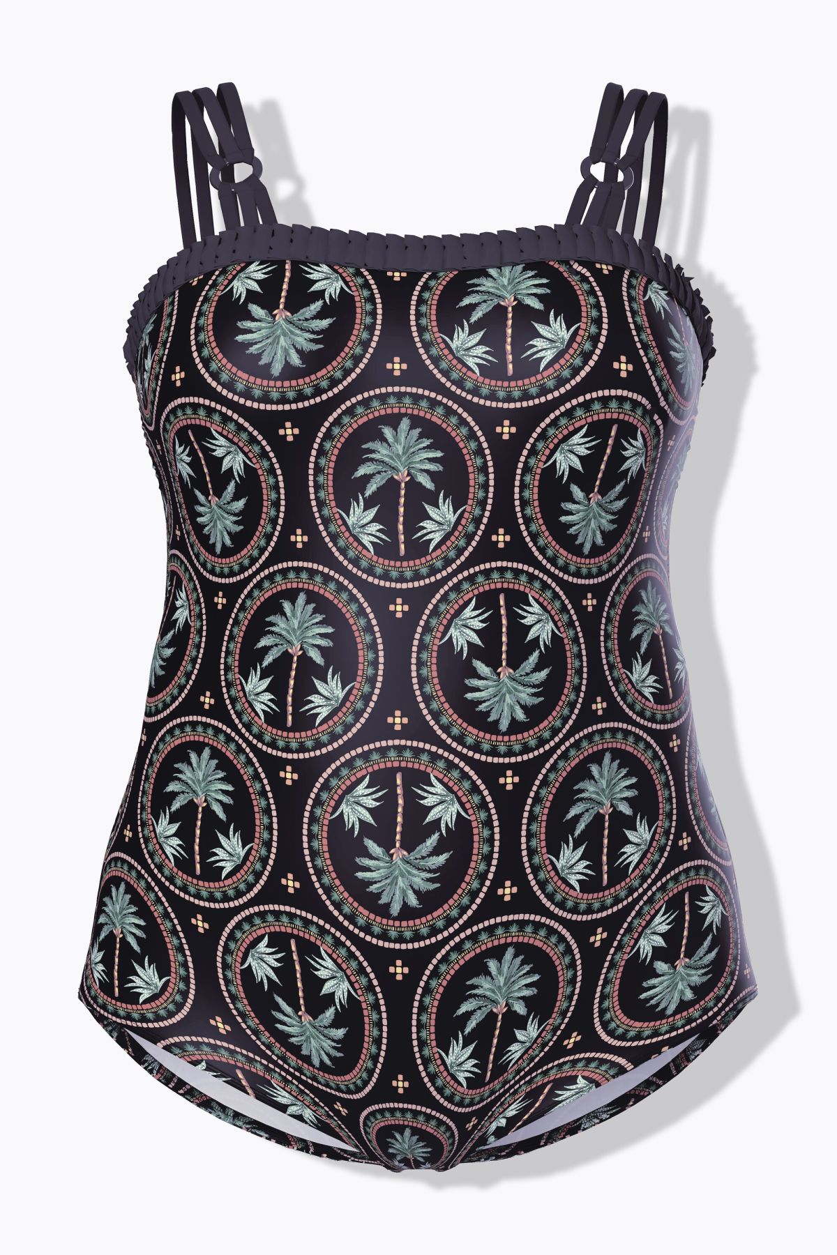 Бански с принт на палми. С лентови презрамки с кръгов детайл. С оформени чашки, еластична лента под бюста за поддържане, подплата отпред. От мека, бързосъхнеща материя.