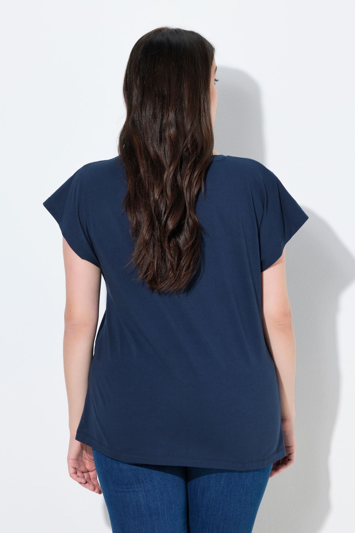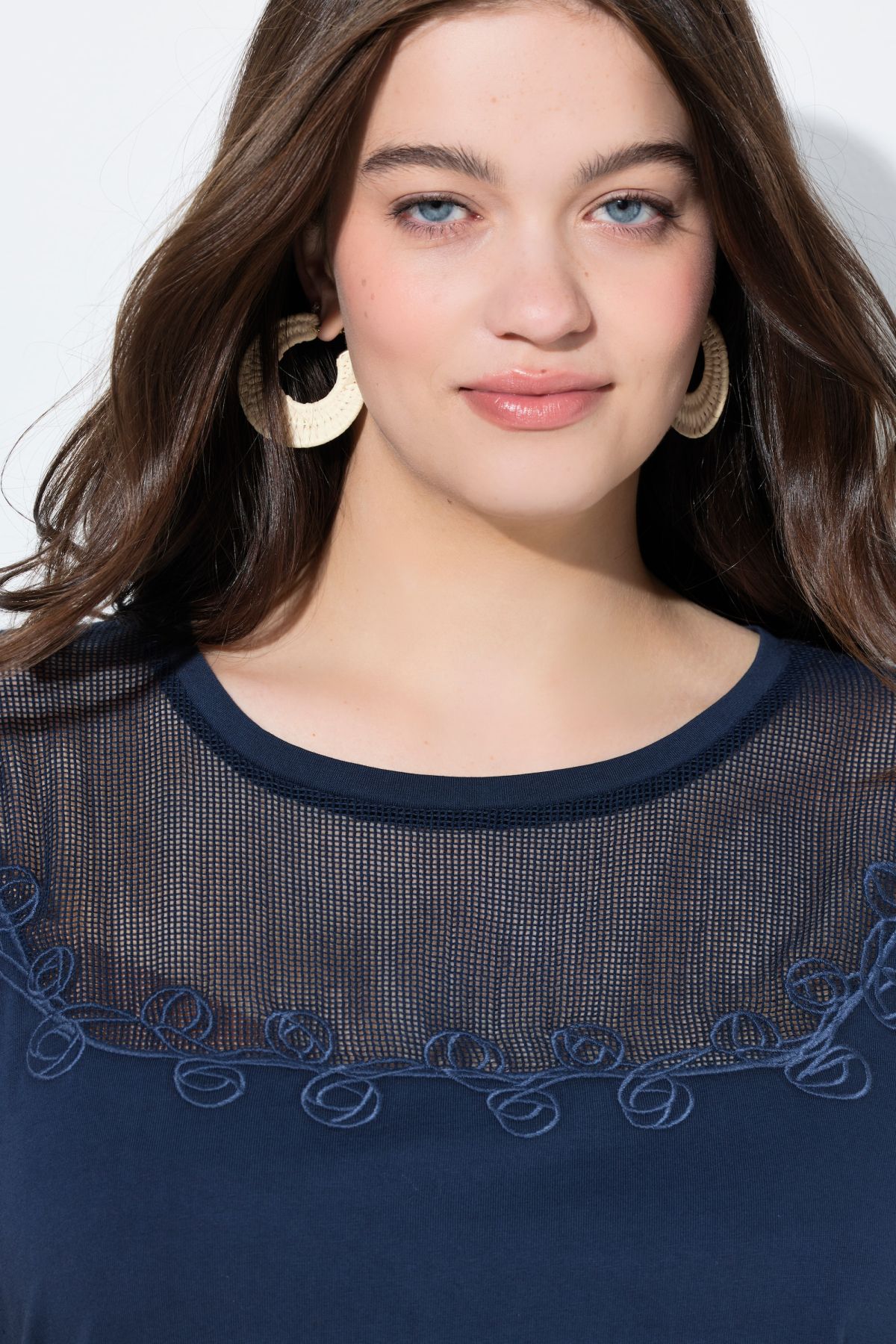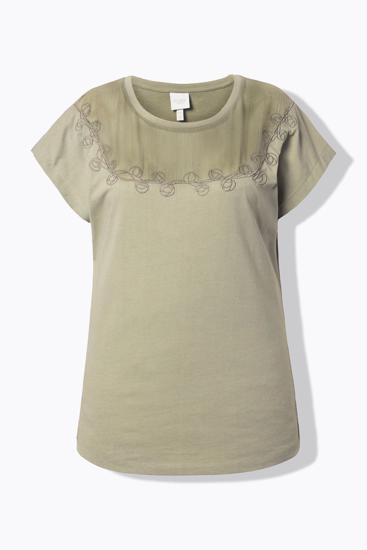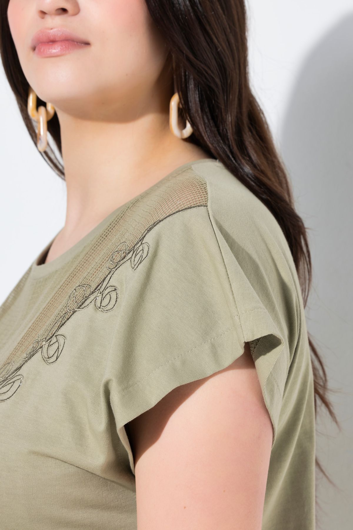 Тениска с мрежест акцент на кръглото деколте с бродирани детайли. С къси ръкави тип шапка и А - линия на силуета. От мека, памучна материя.
