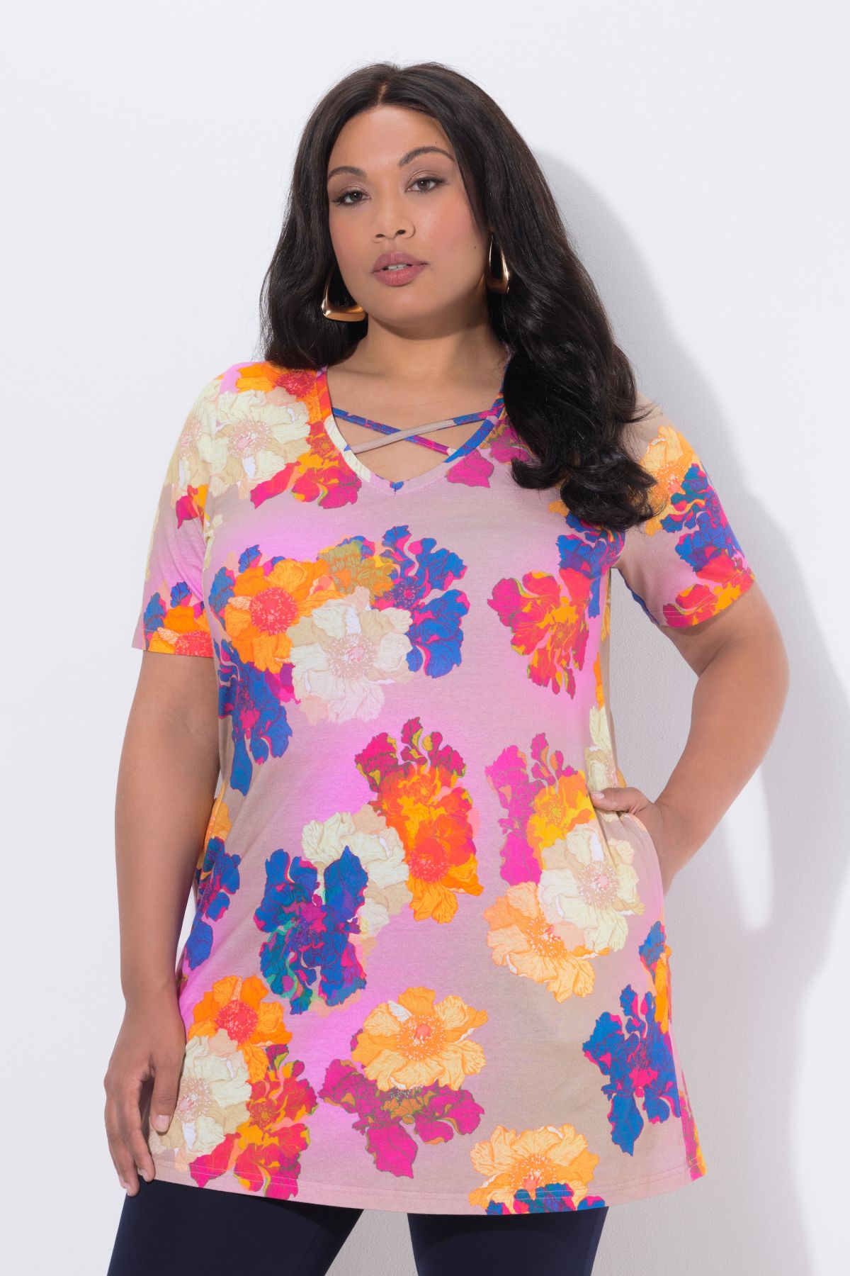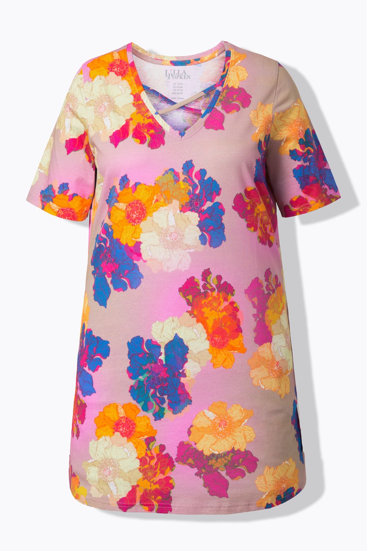 Туника с принт на цветя с кръгло деколте с лентови детайли. С къси ръкави, А - линия на силуета и странични шевови джобове. От мека, памучна материя.