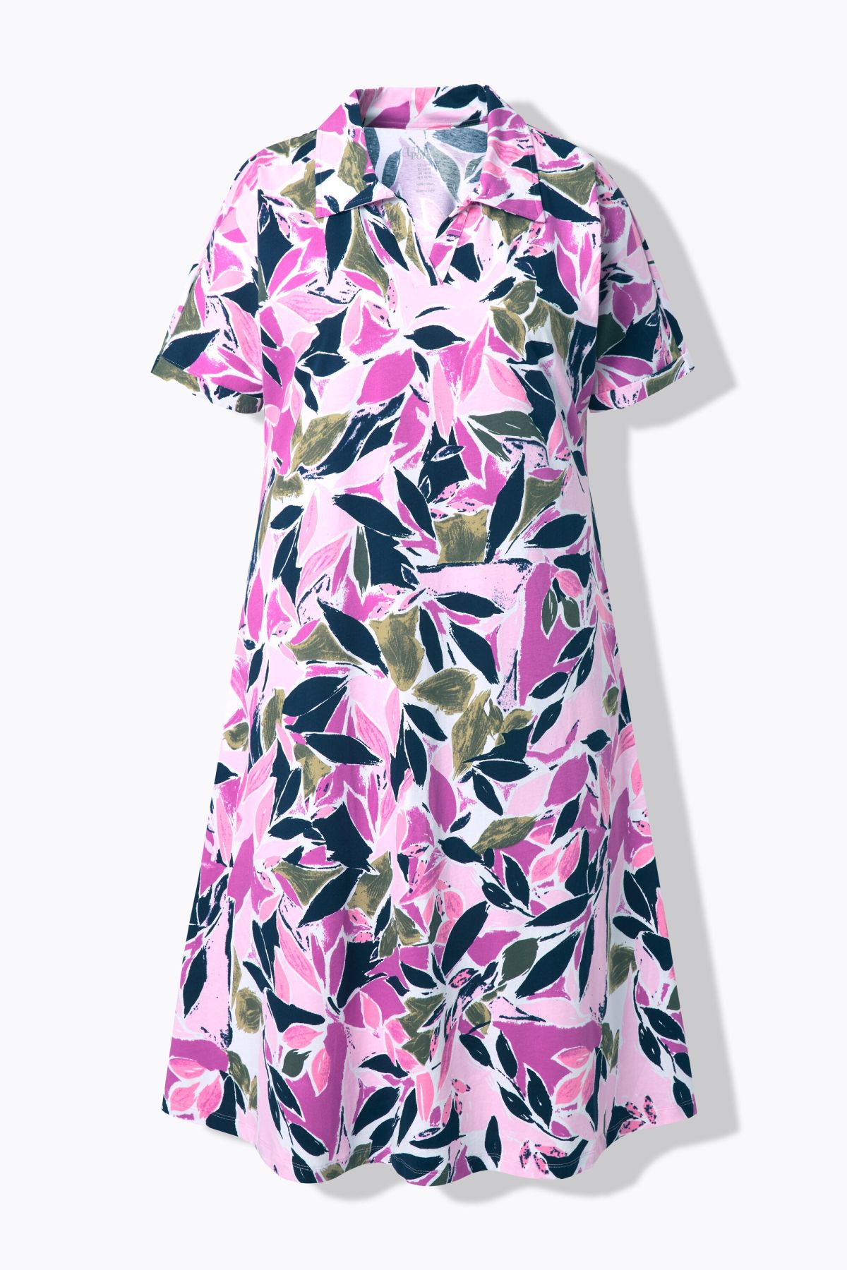 Рокля с флорален принт и яка на риза. Класическа кройка с А-силует, къси ръкави с маншет и паднали рамена, странични джобове. Изработена от мек и еластичен трикотаж.