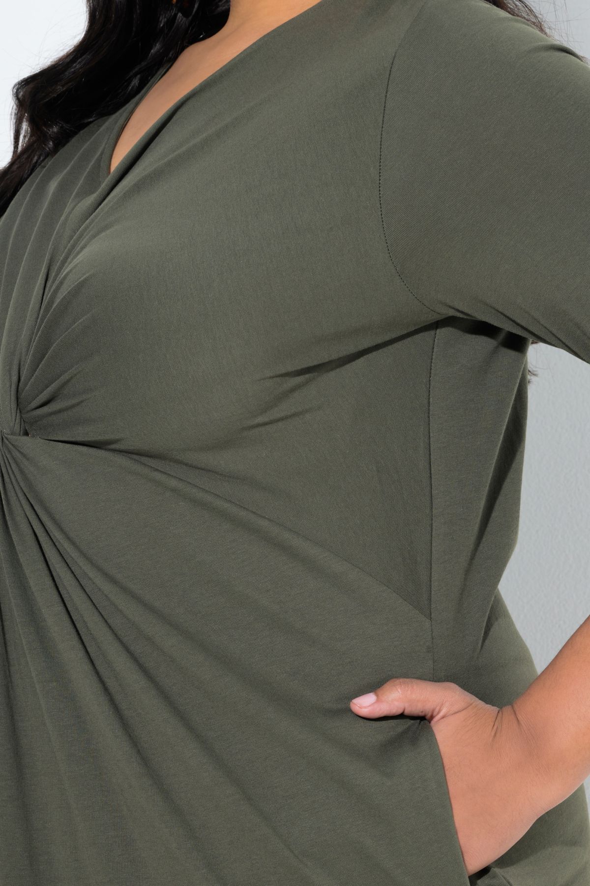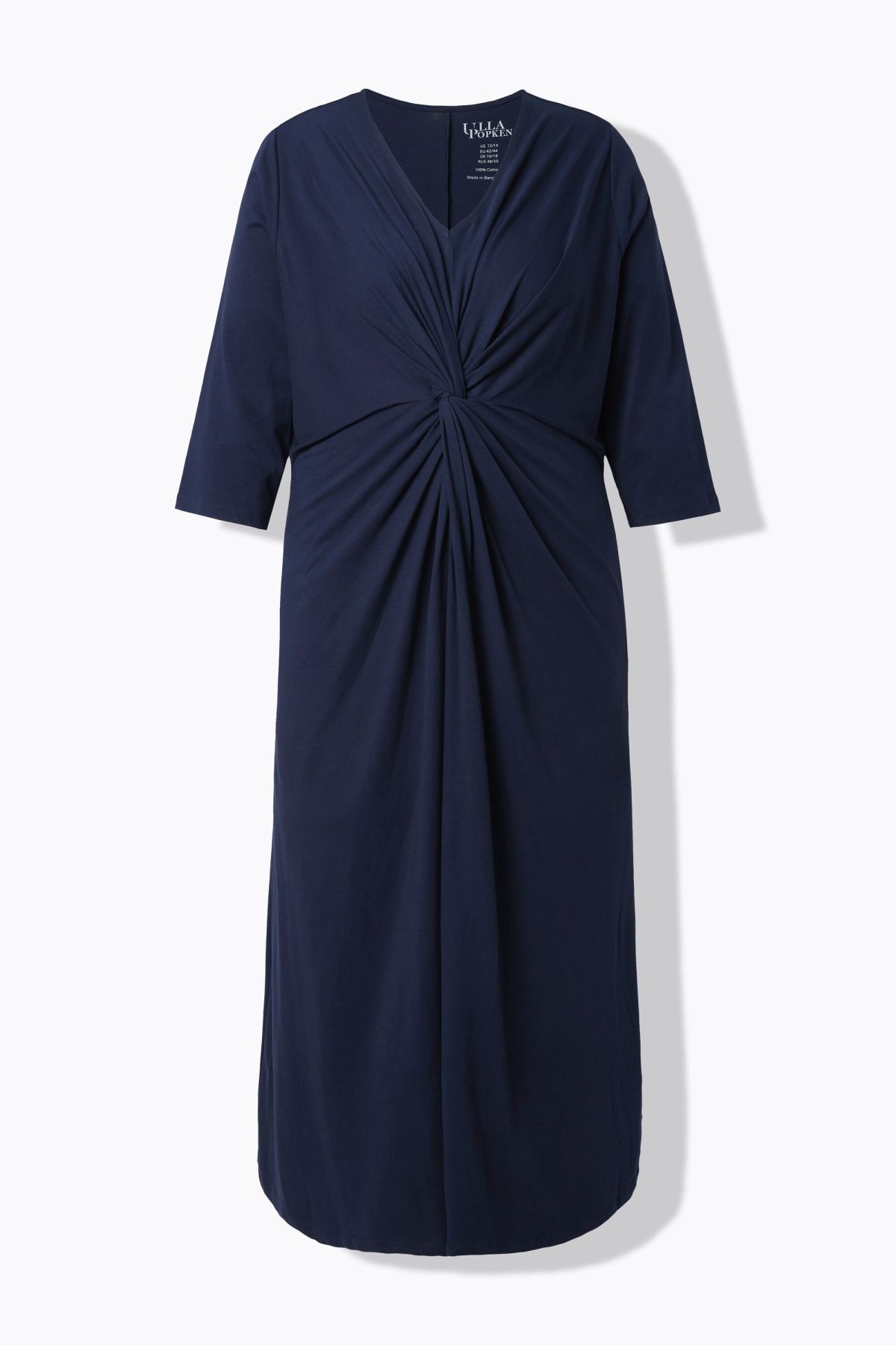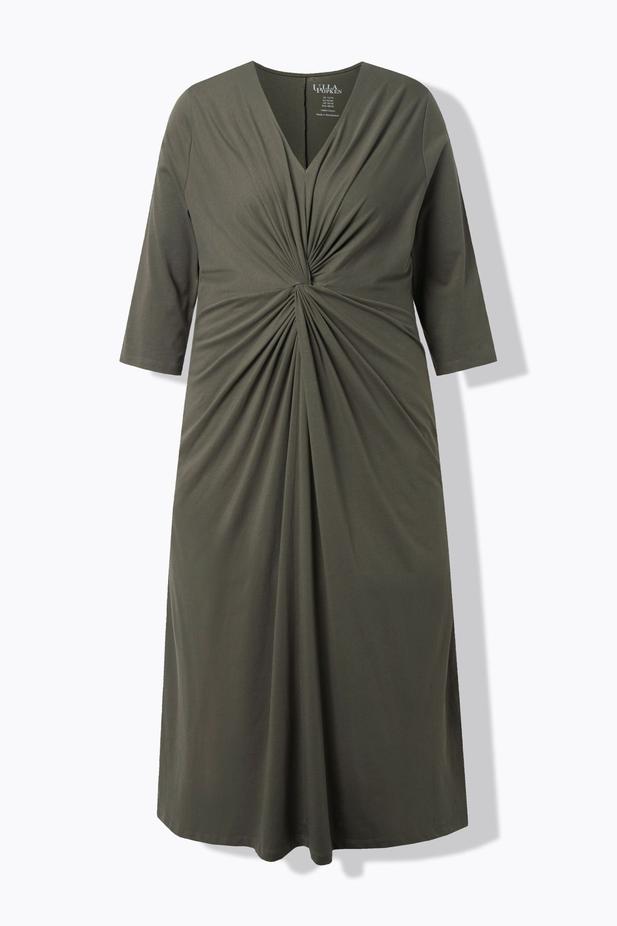 Рокля с елегантно преплетена предница и V-образно деколте. 3/4 ръкави с маншет, А-силует, странични джобове. Изработена от мек памучен материал.