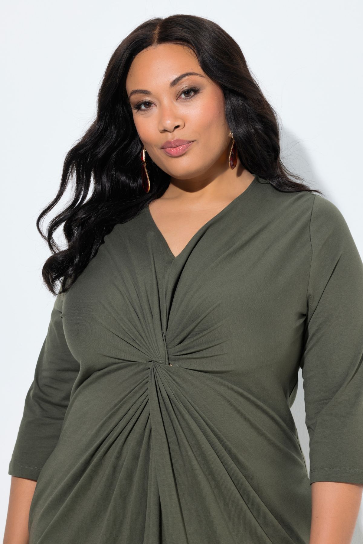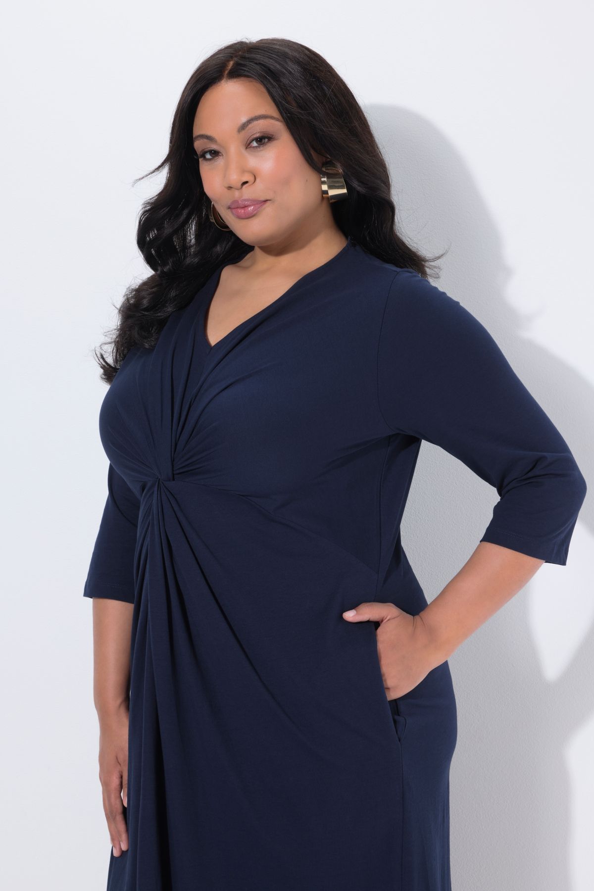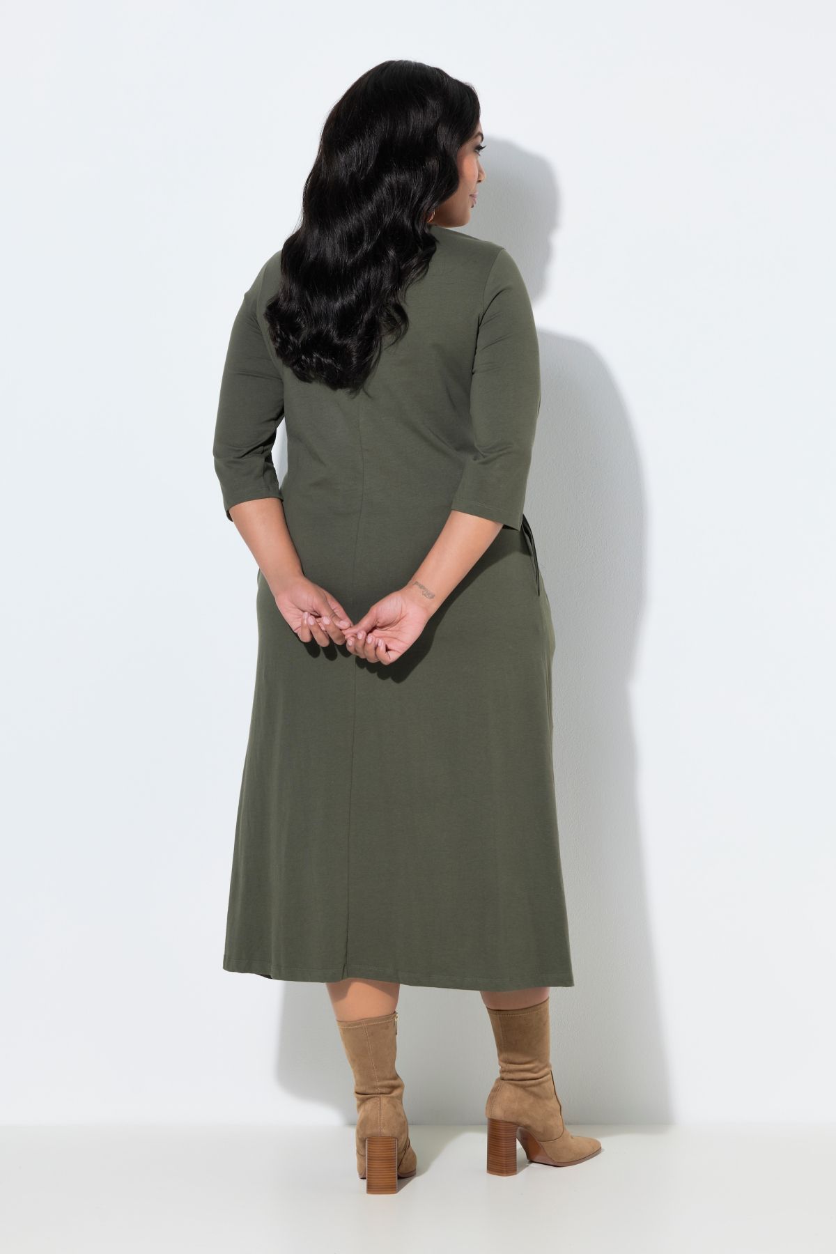 Рокля с елегантно преплетена предница и V-образно деколте. 3/4 ръкави с маншет, А-силует, странични джобове. Изработена от мек памучен материал.