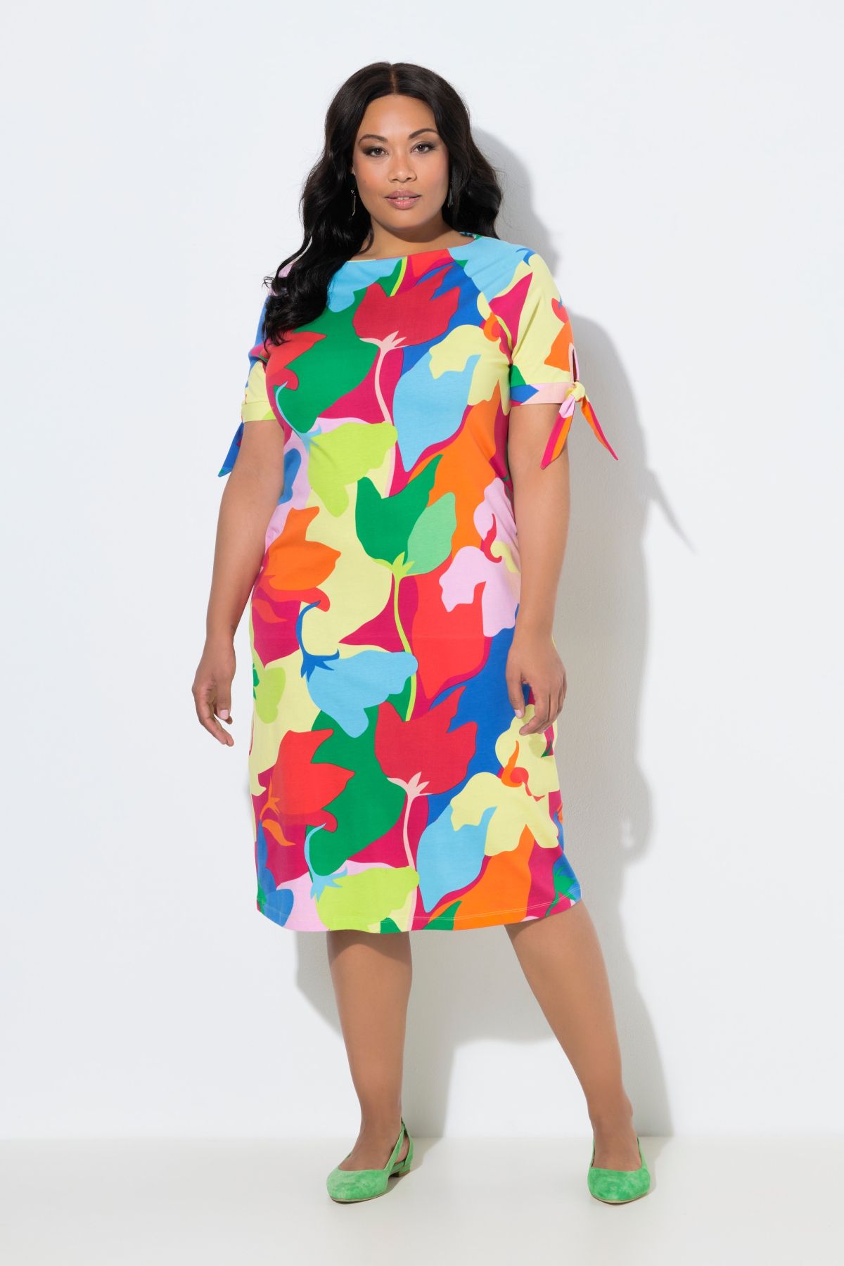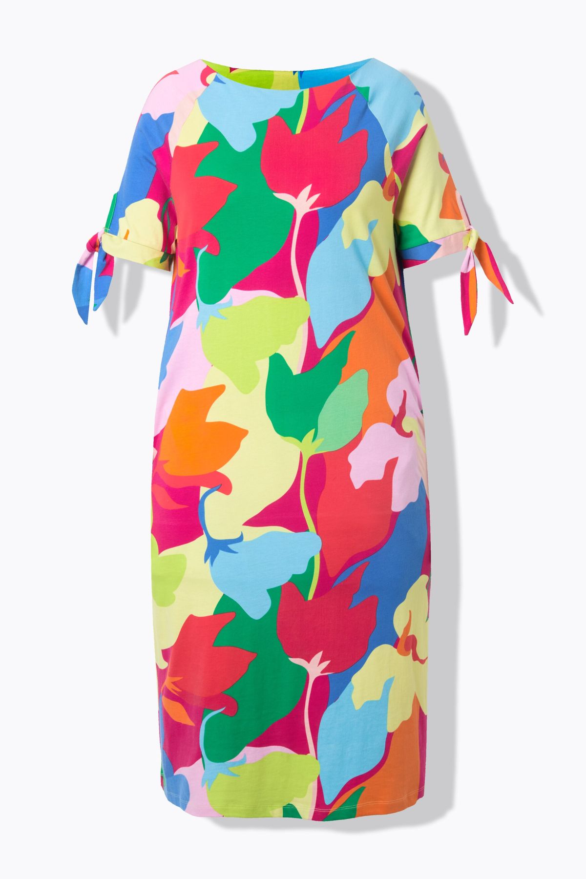 Рокля с дължина до коленете и принт на цветя. Кръгло деколте тип лодка, къси ръкави с връзки на маншетите, странични джобове. Класическа кройка с А-силует, от меко трико.