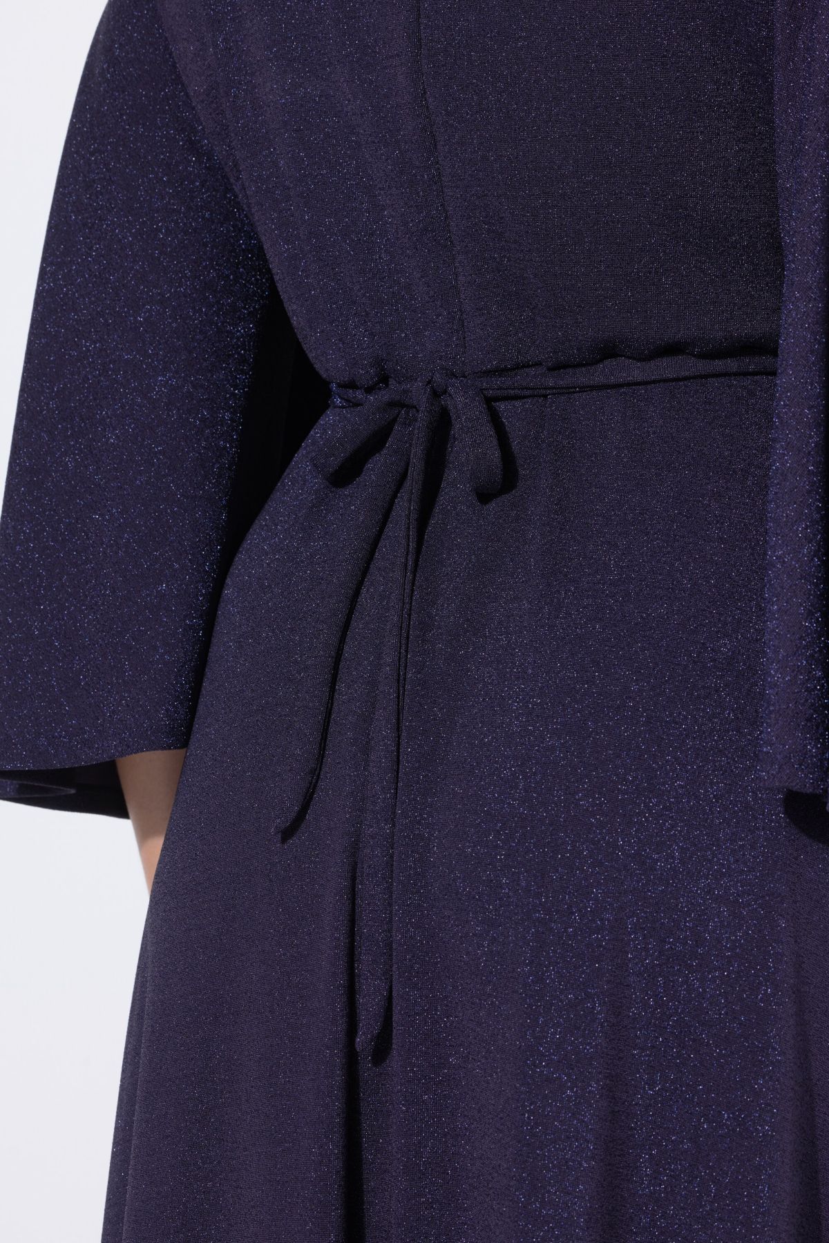 Елегантна рокля с брокат и колан с декоративни камъни. V-образно деколте тип прегърни ме, 3/4 ръкави тип крило, скрит цип на гърба. Вталена горна част и свободно падаща дълга пола с непрозрачен хастар.