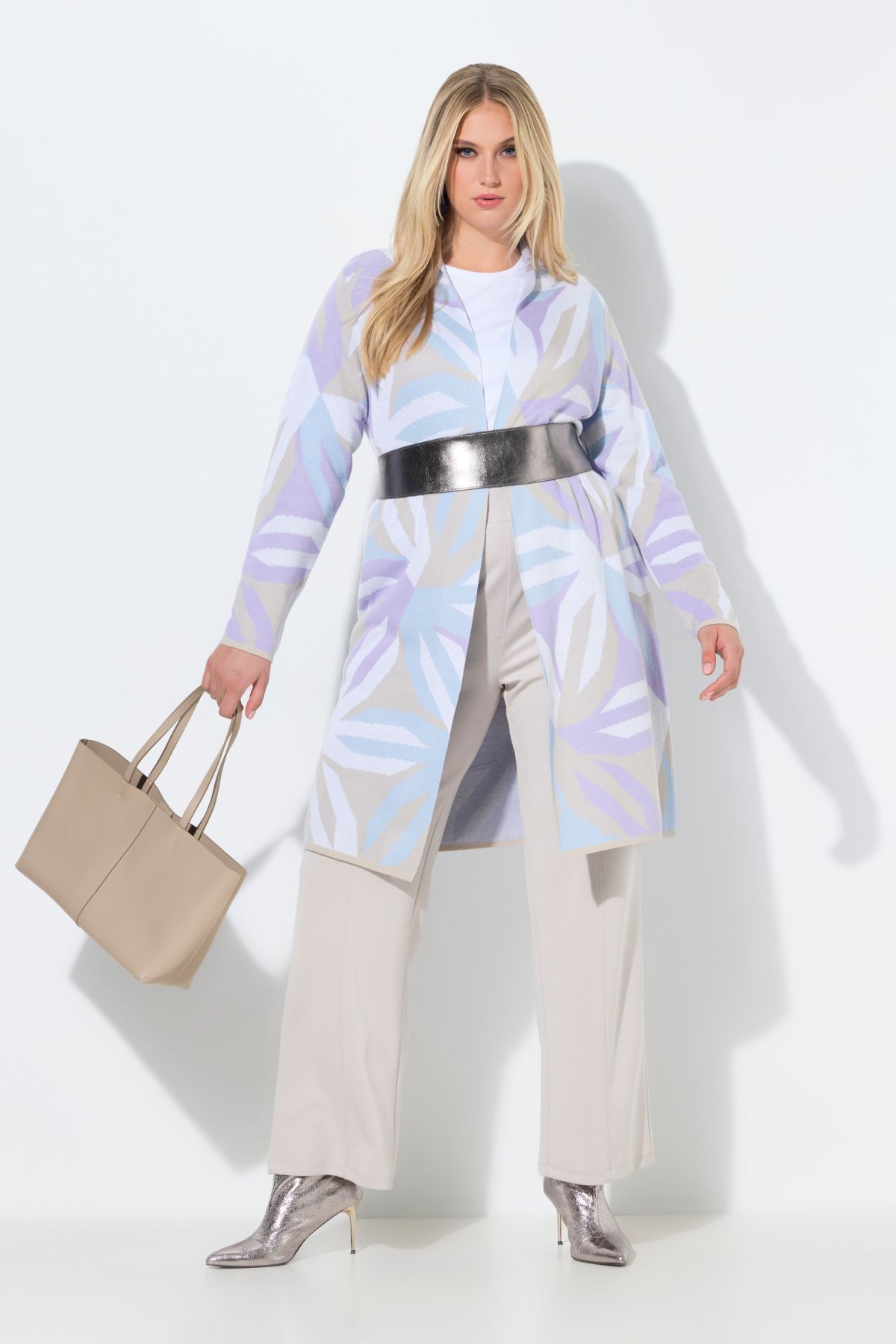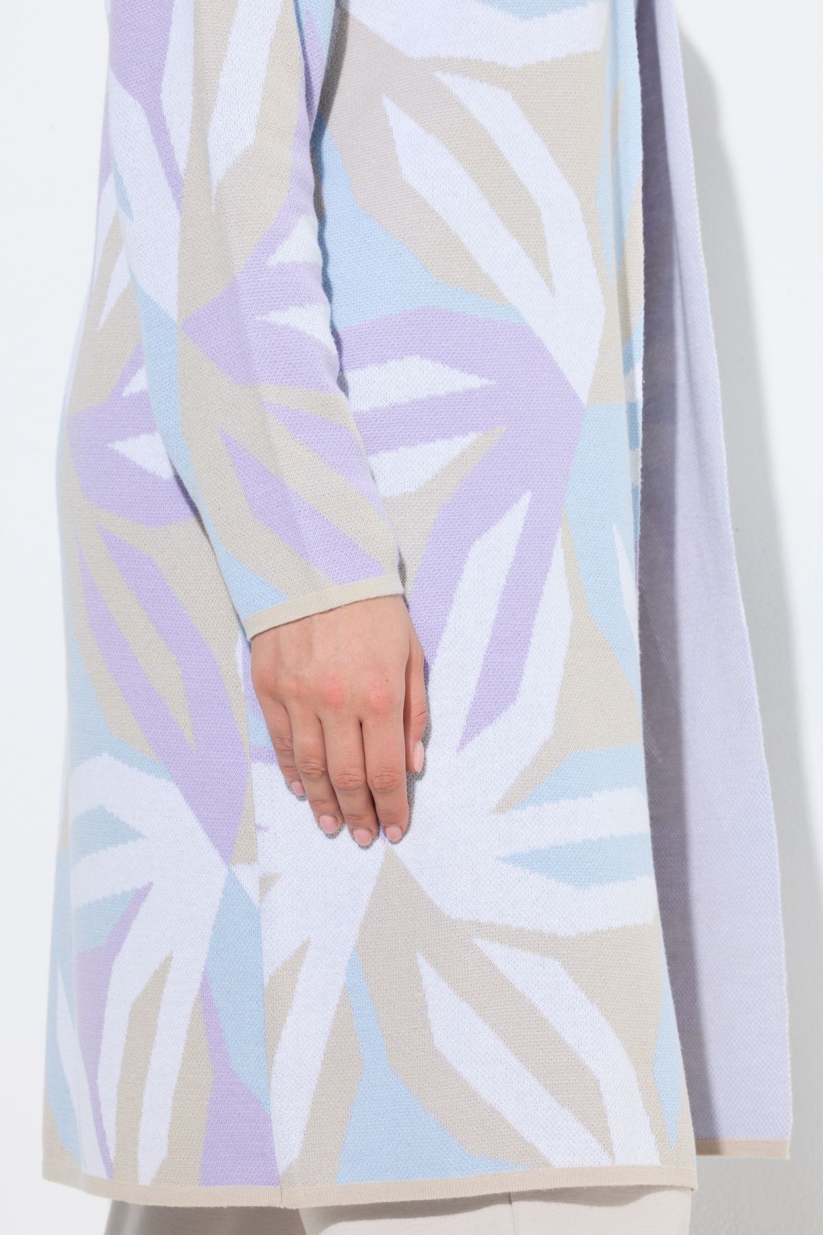 Дълга жилетка с цветни мотиви. Дълги ръкави, столче яка, небрежен стил без закопчаване. Изработена от мека плетка от памучна смес.