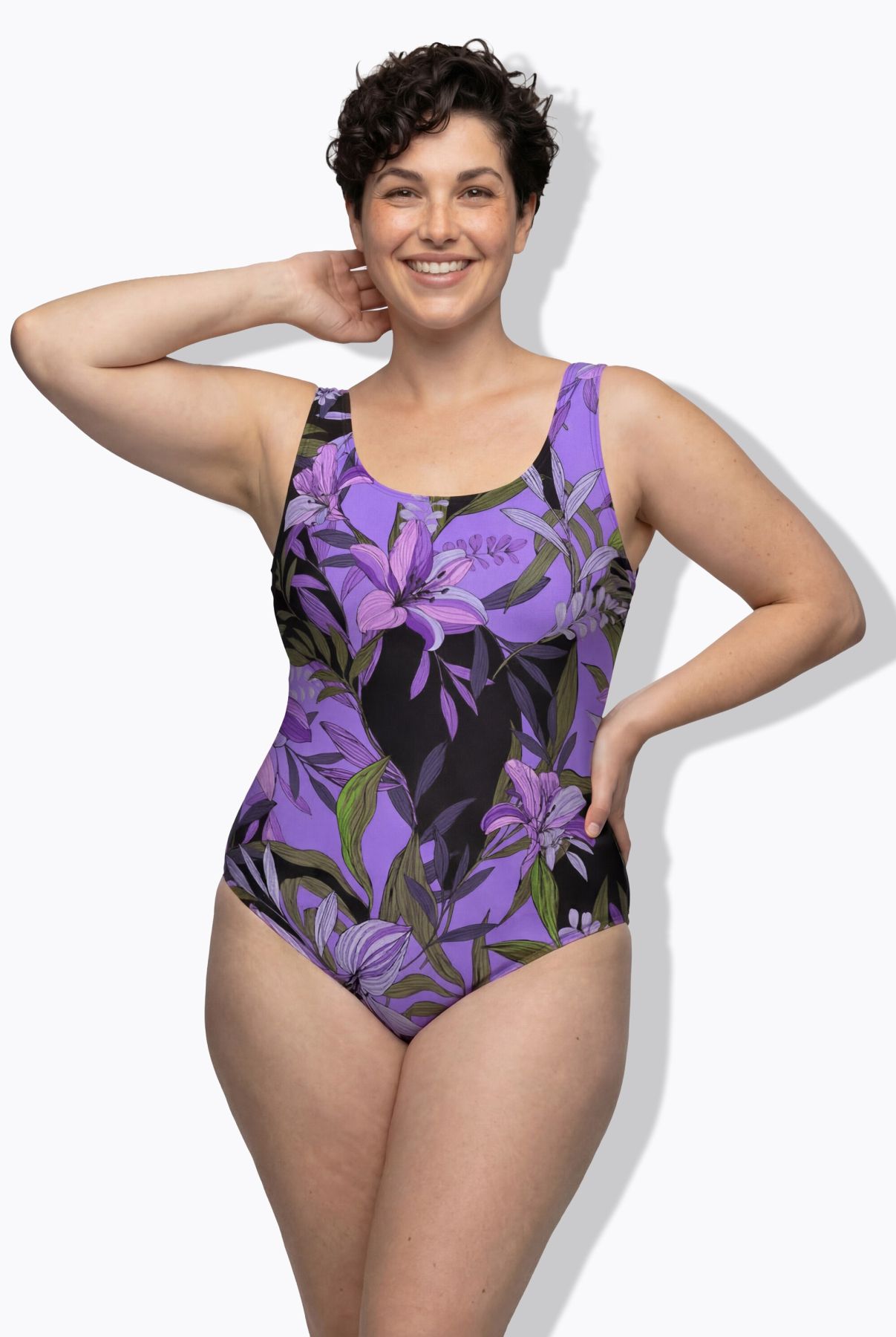 Бански с принт на лилии с широки удобни презрамки. Еластична поддържаща лента под бюста, без оформени чашки, подплата на предната част, кръгло деколте. Подходящ за различни видове спорт.