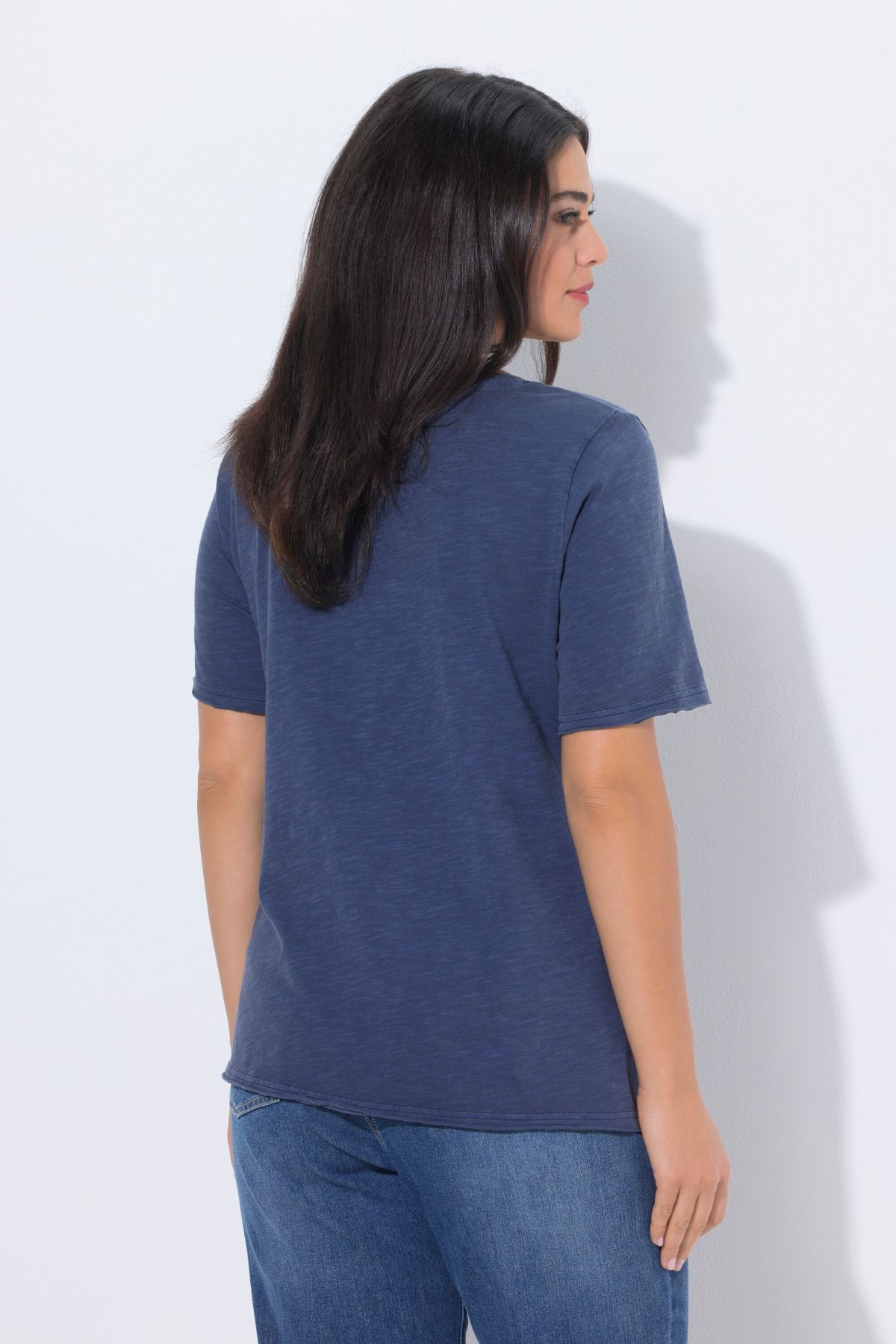 Тениска с надпис и принт на пеперуда. Къси ръкави с маншет, закръглено V-образно деколте, класическа кройка, странични цепки на подгъва. Изработена от чист памучен материал.
