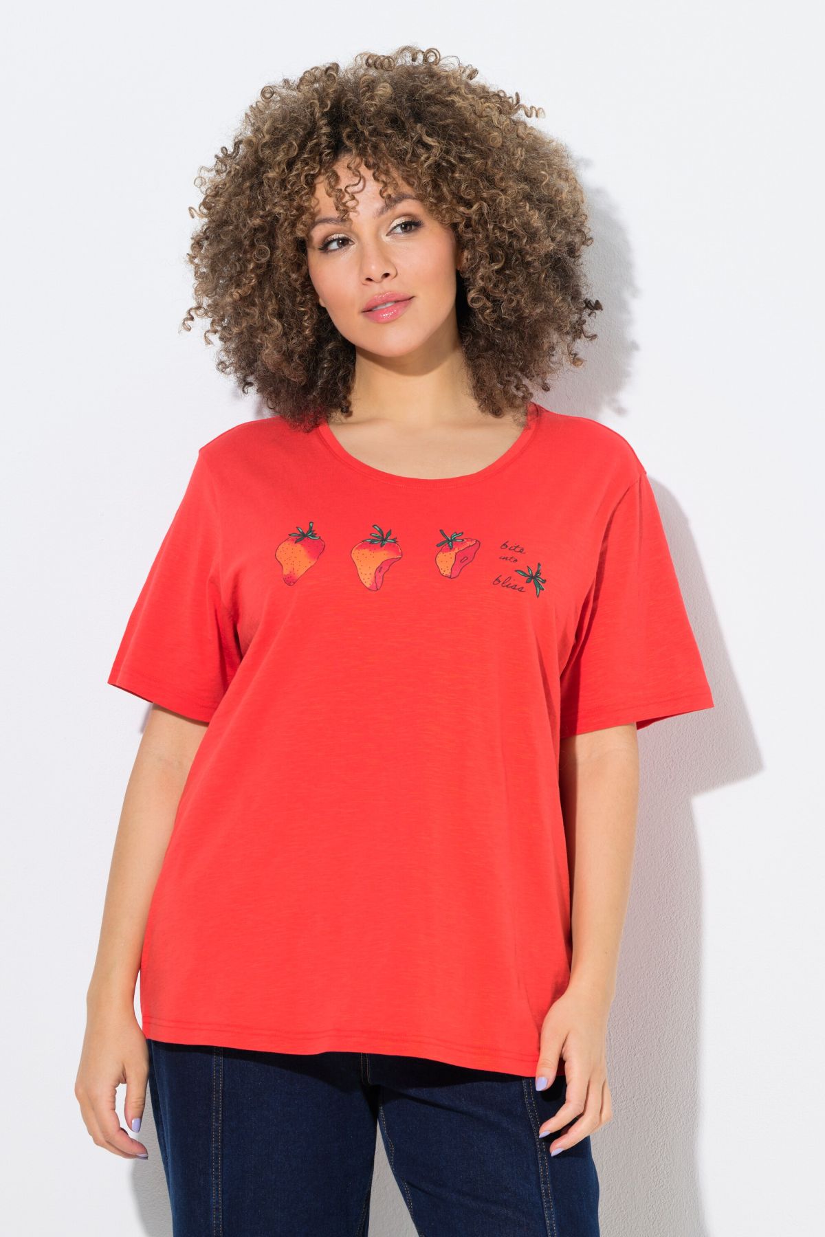 Тениска със закачлив принт на ягоди на гърдите. Свободно кръгло деколте, къси ръкави с маншет и паднало рамо, класическа кройка. Изработена от памучен трикотаж.