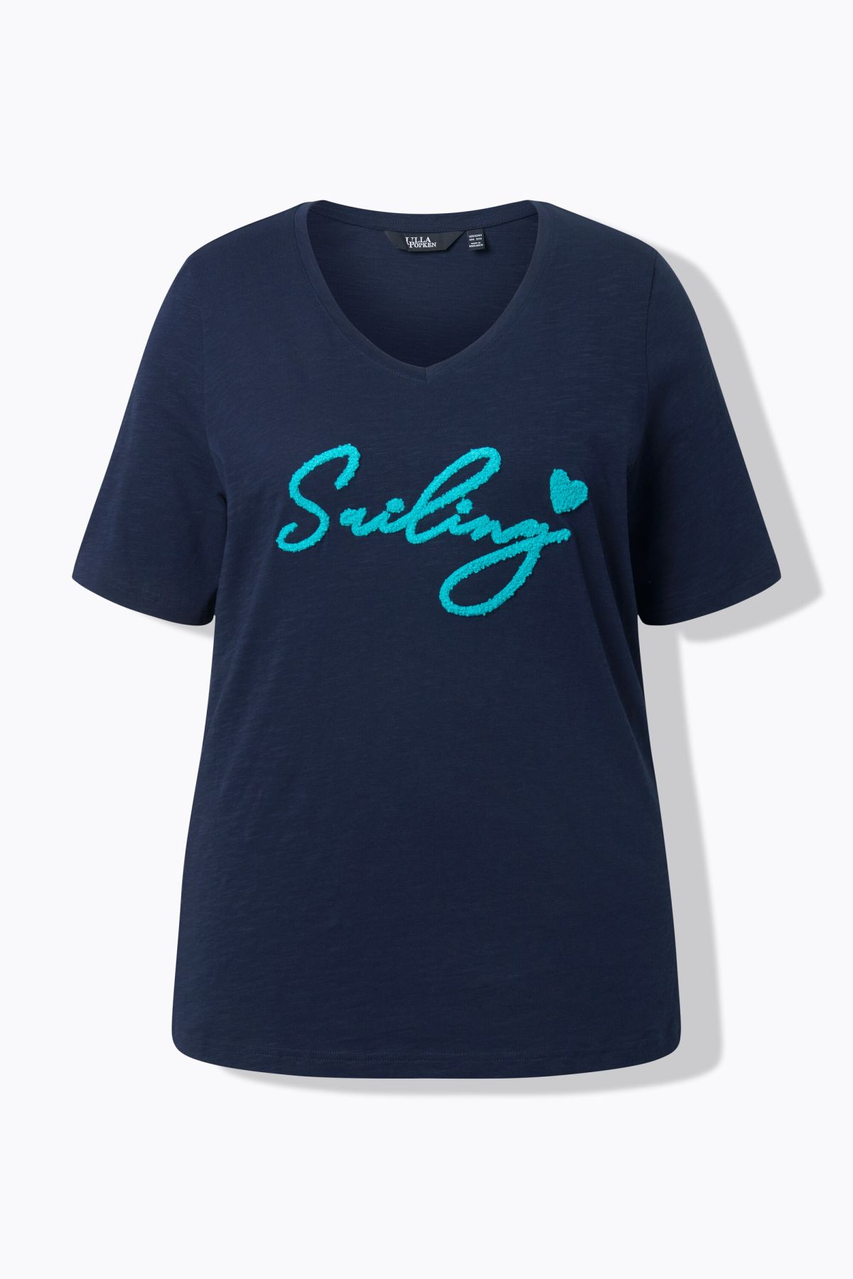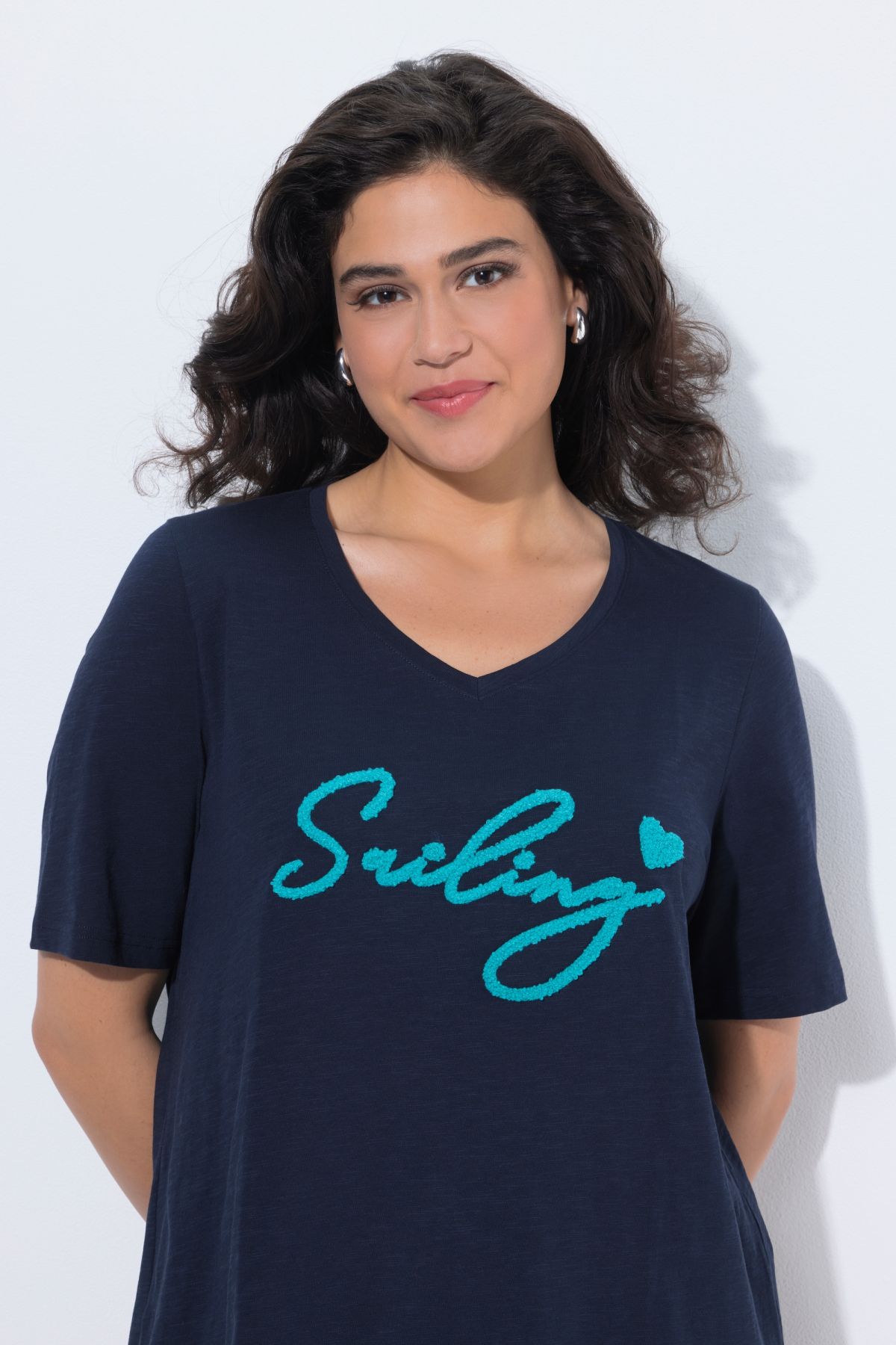 Тениска с пухкав надпис. Класическа кройка с V-образно деколте, къси ръкави с по-широк маншет, странични цепки на подгъва. Изработена от чист памук.