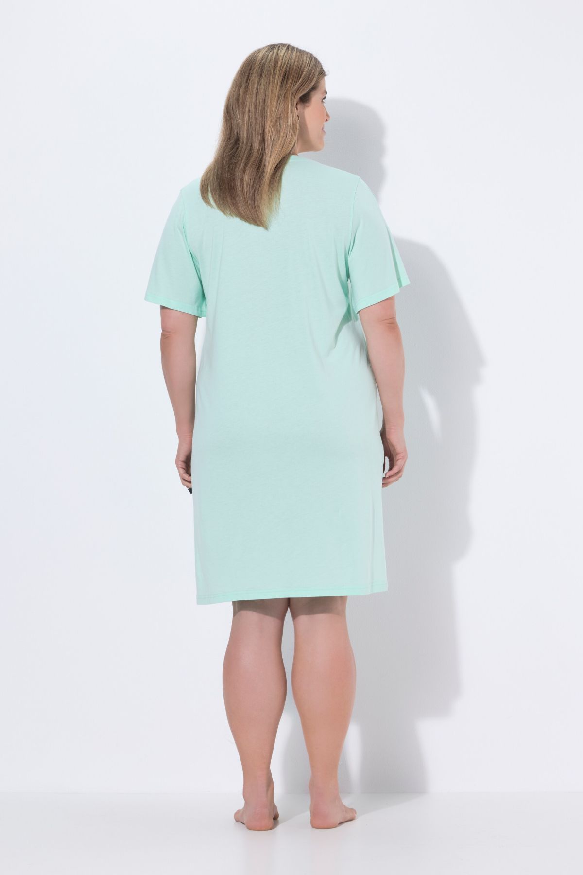 Комплект от 2 броя нощници - едната е едноцветна, а другата с щампа на листа. Овърсайз кройка, V-образно деколте тип туника, къси ръкави с маншети, странични цепки в долната част. Изработени от мек памучен материал.