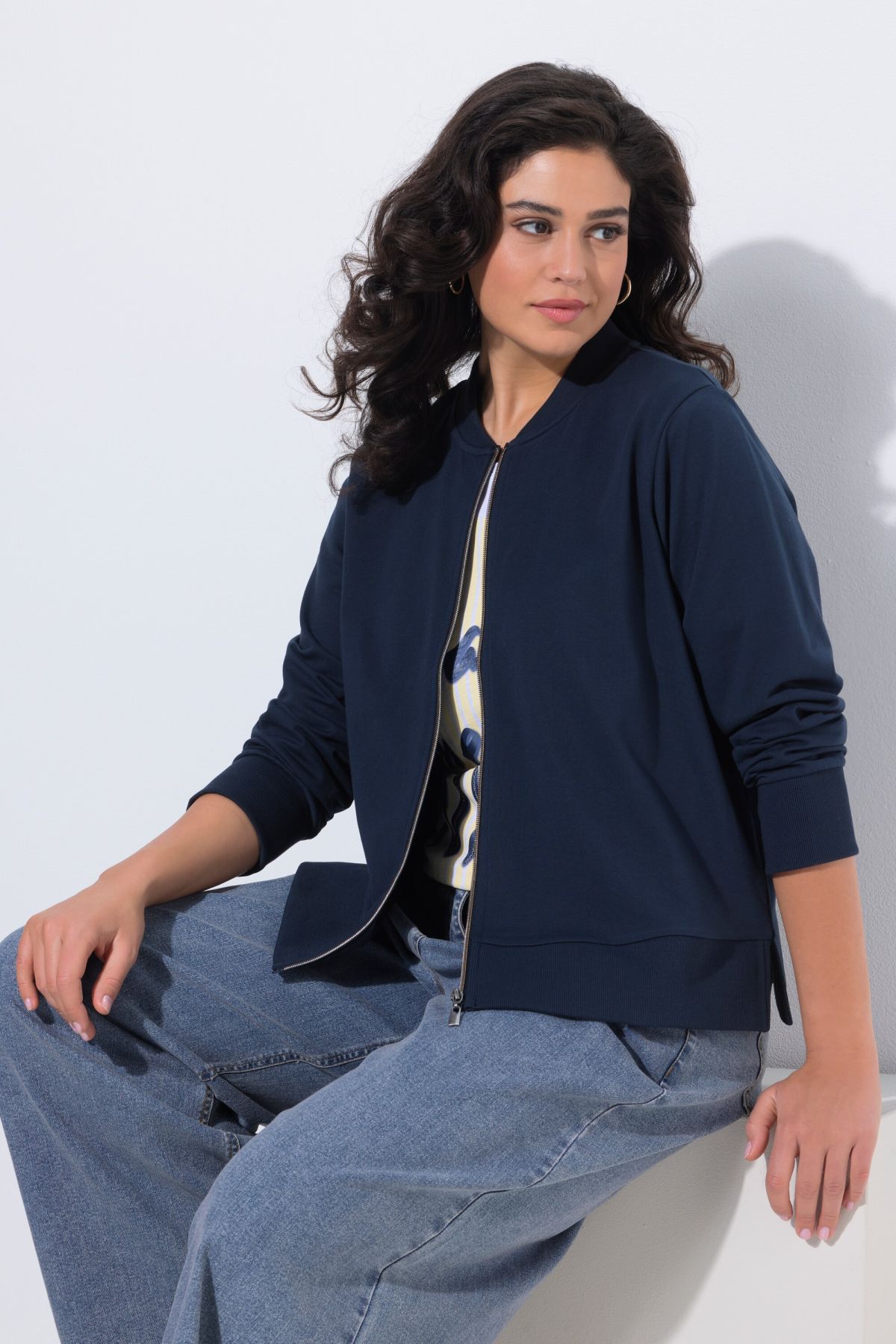 Суитчър с къса, свободна кройка. С колежанска яка, цип отпред и дълги ръкави. Рипсени маншети и странични цепки на подгъва за повече комфорт.
