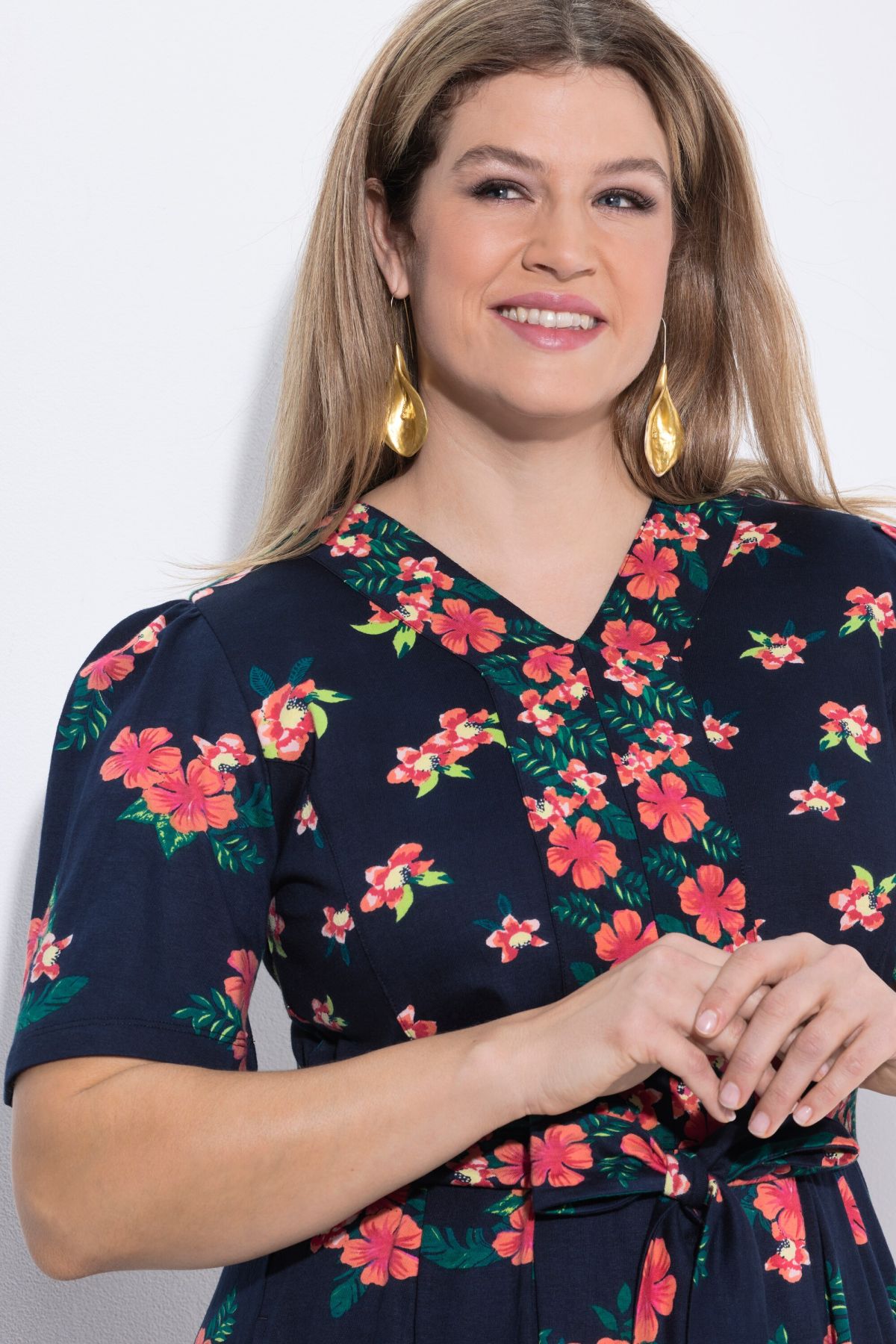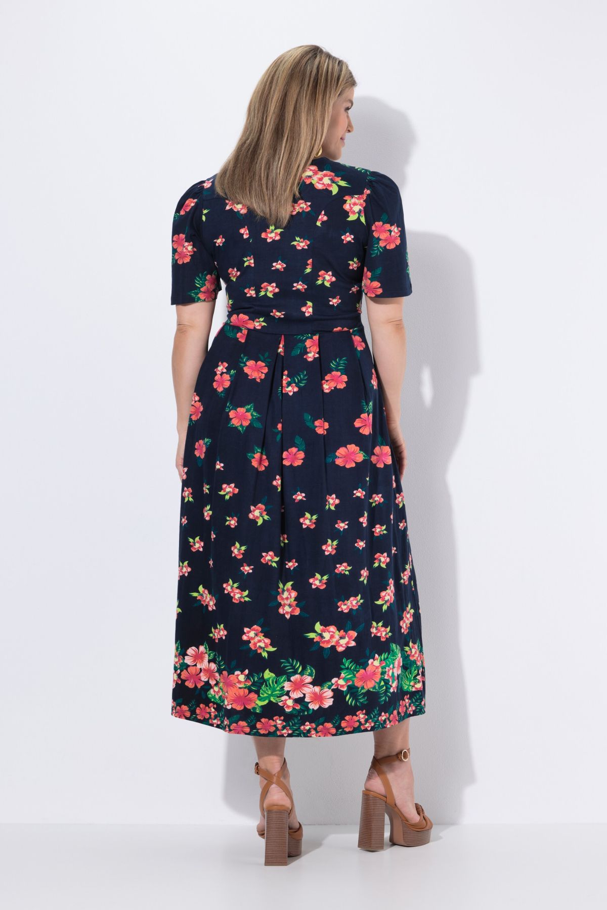 Рокля с принт на хибискус - женствена с шевови акценти и принт на цветя. С V - образно деколте, копчета до талията и къси ръкави. С разкроена пола и странични шевови джобове.