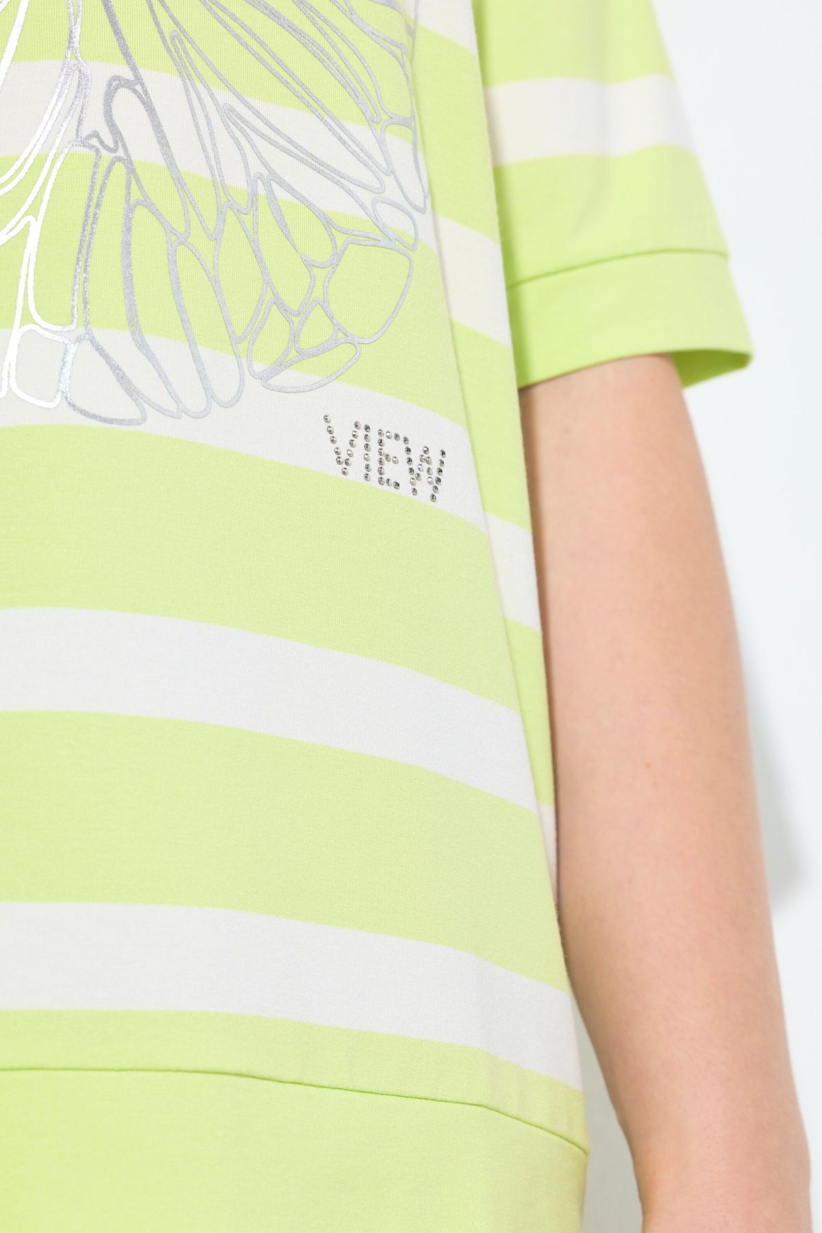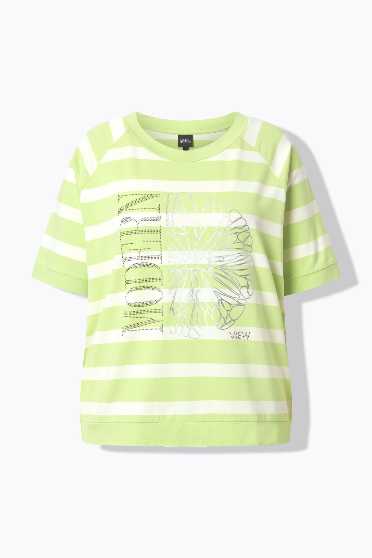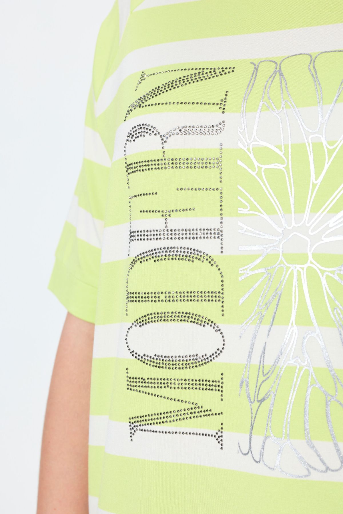 Тениска с графичен принт на райета от мека, трикотажна материя. С декоративен акцент на лайм с камъчета. С кръгло деколте и реглан ръкави.