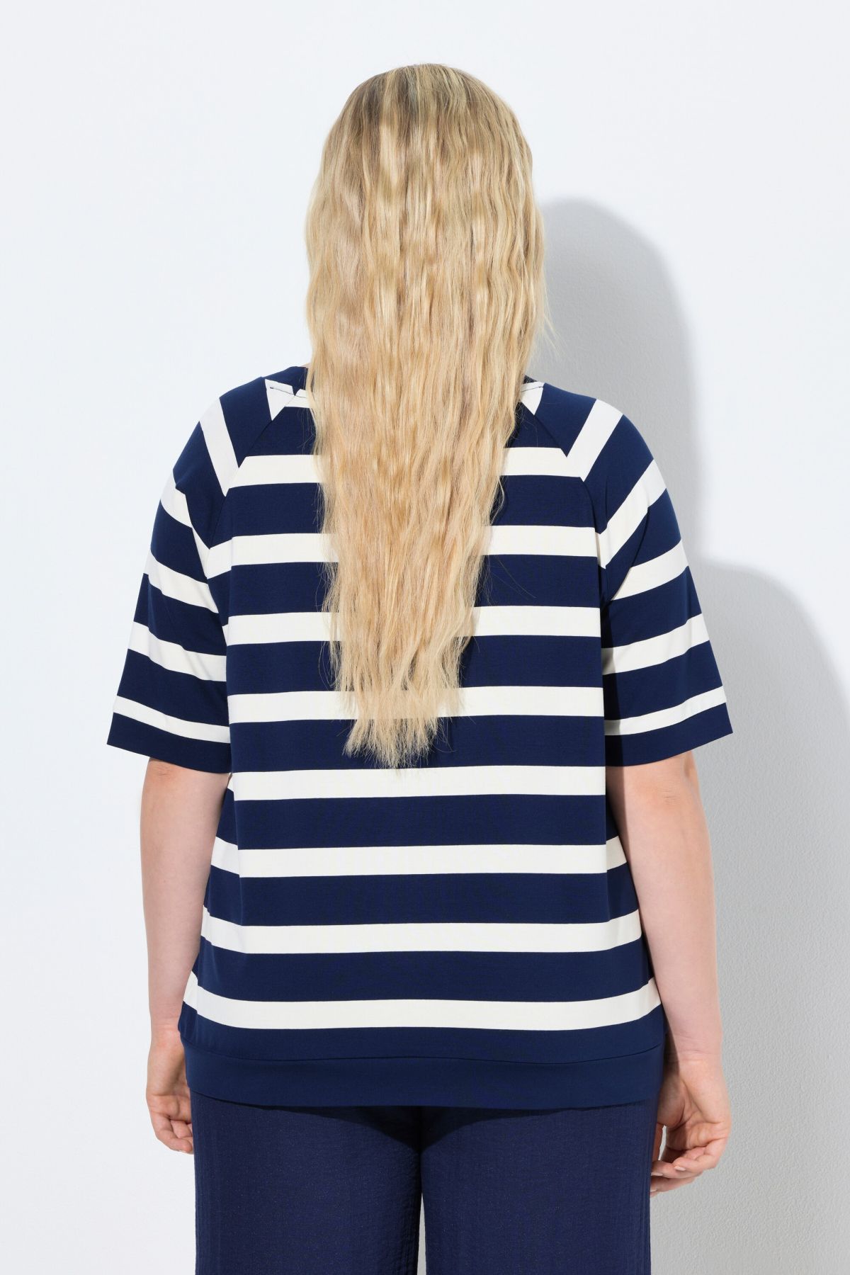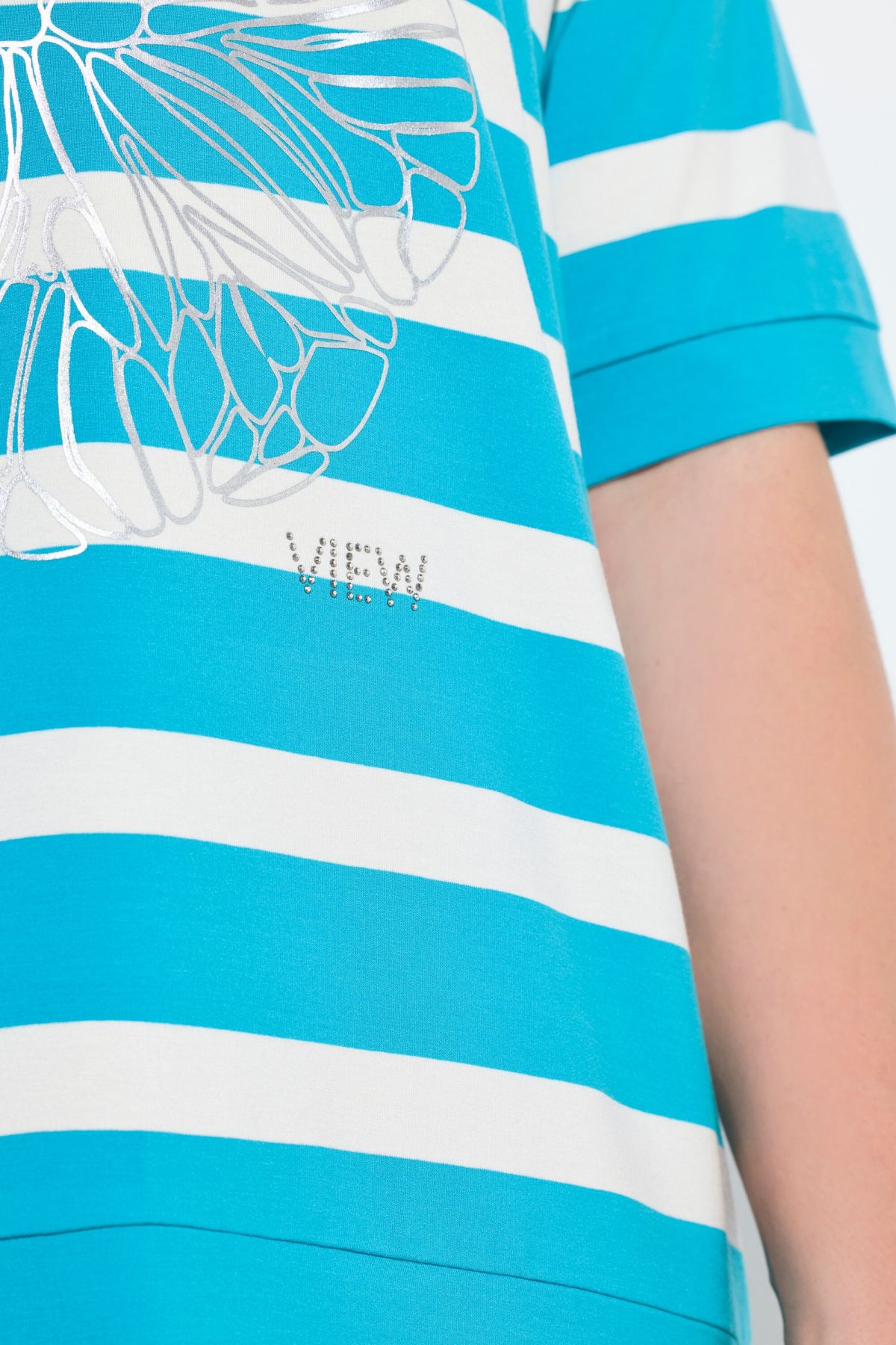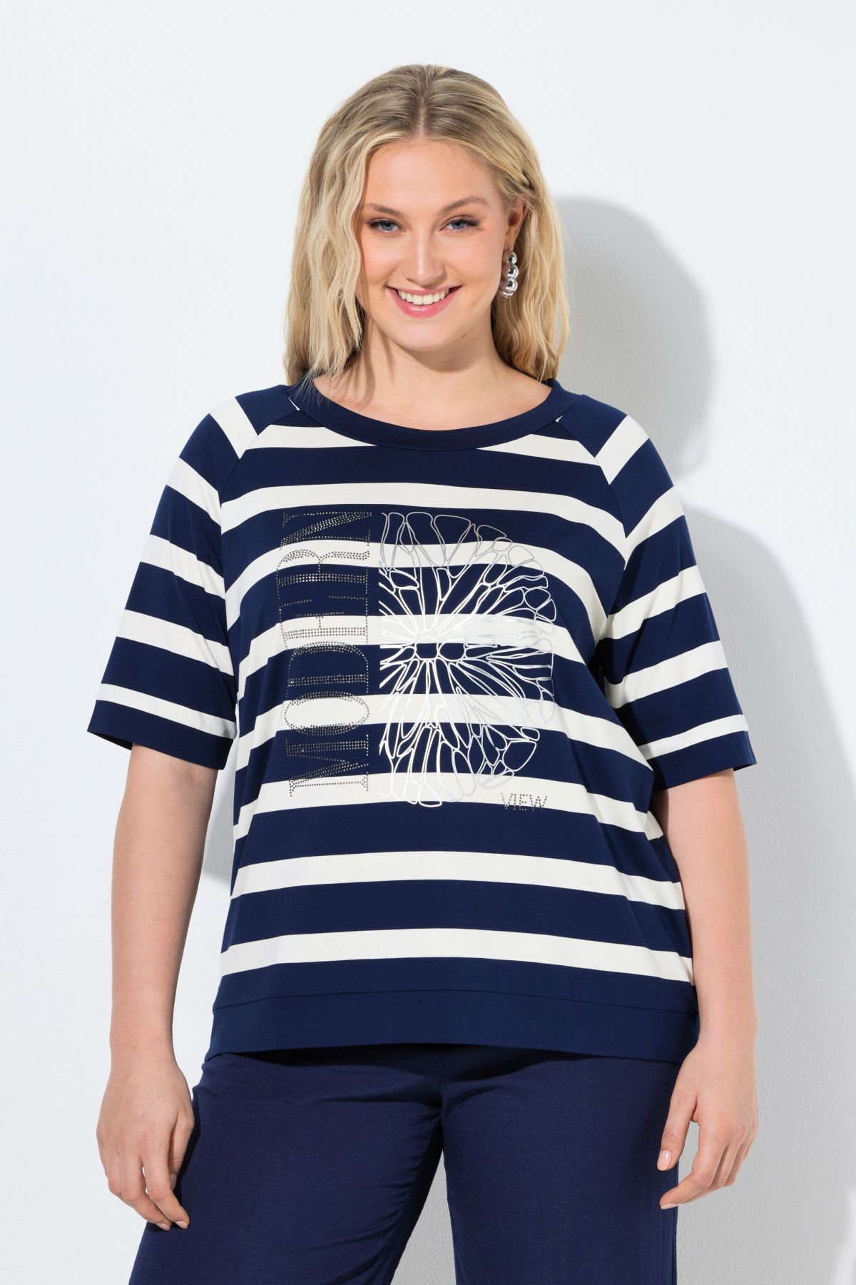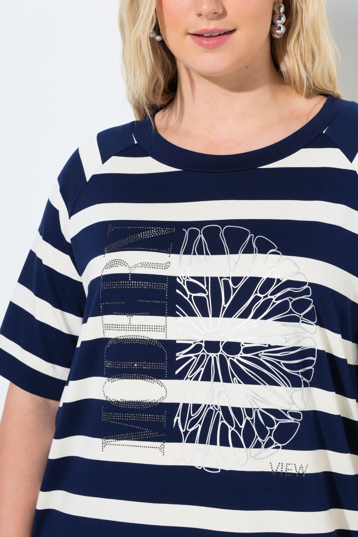 Тениска с графичен принт на райета от мека, трикотажна материя. С декоративен акцент на лайм с камъчета. С кръгло деколте и реглан ръкави.