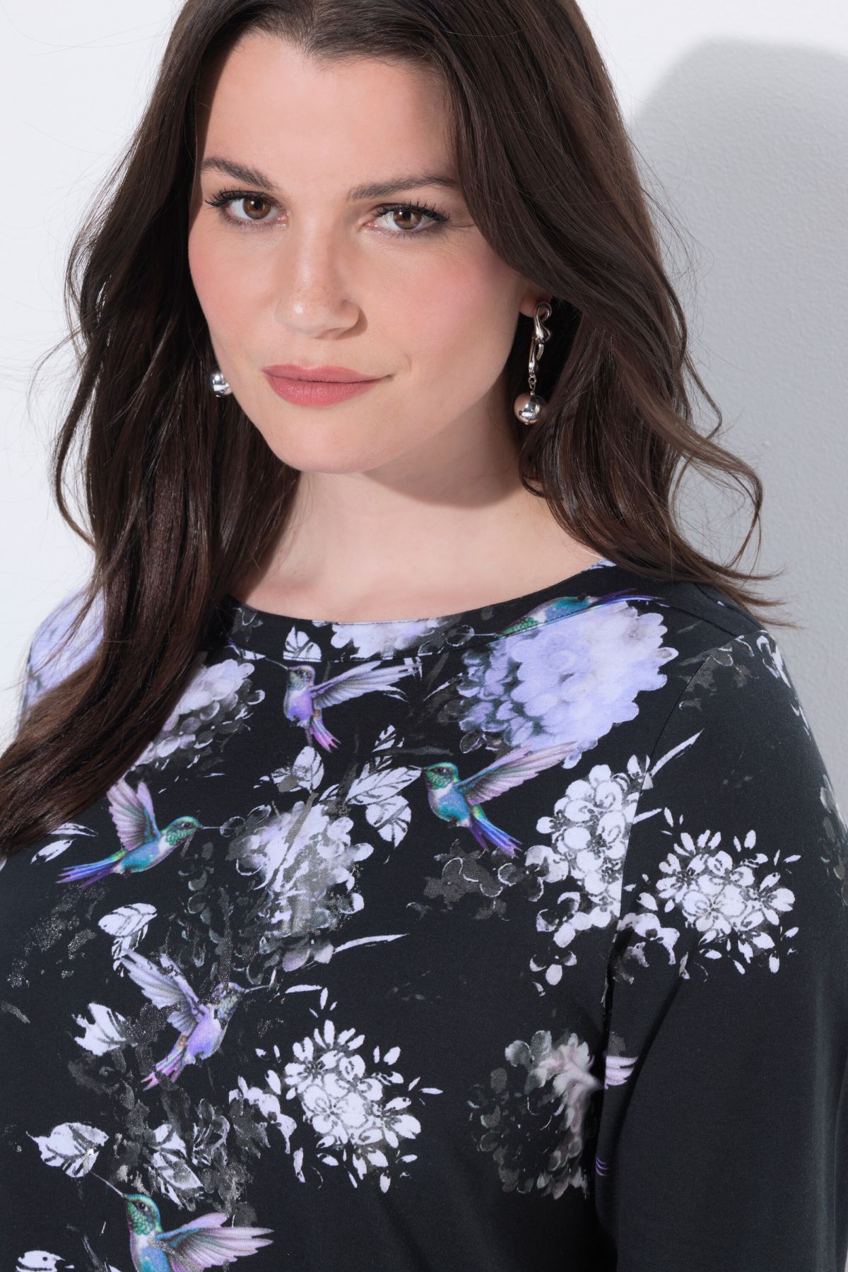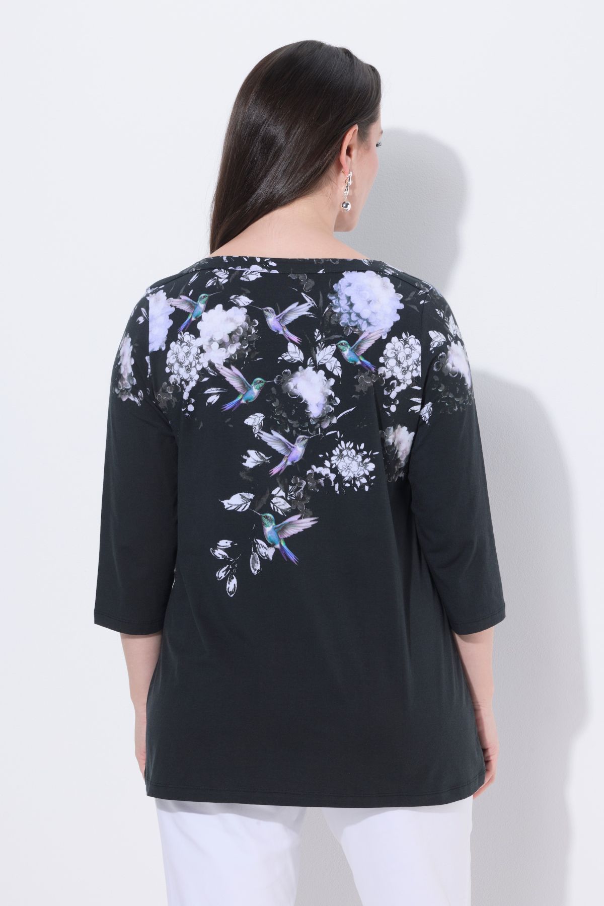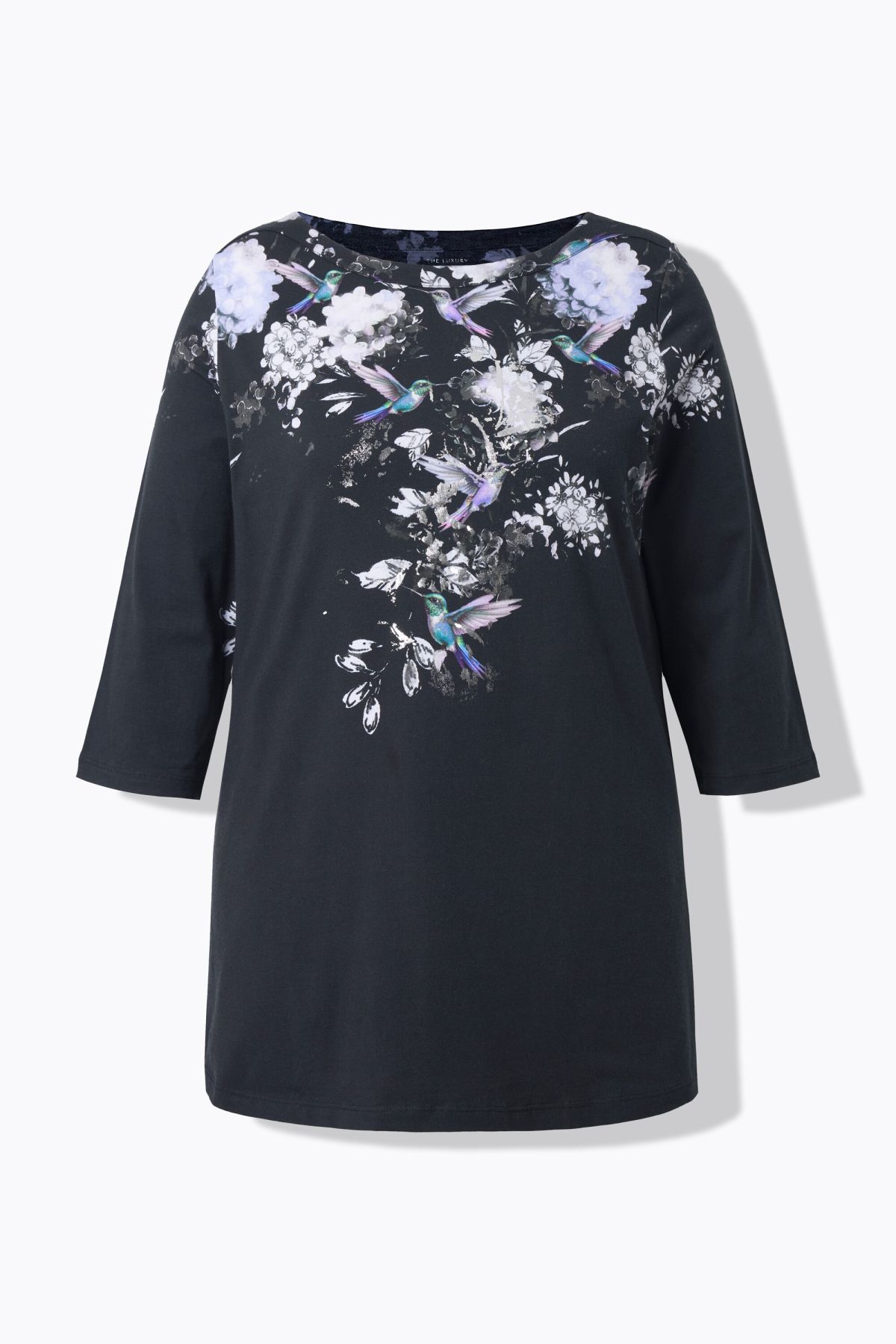 Тениска с принт на райета, цветя и колибри на раменете. С деколте тип лодка, 3/4 ръкави и А - линия на силуета. От мека, памучна материя