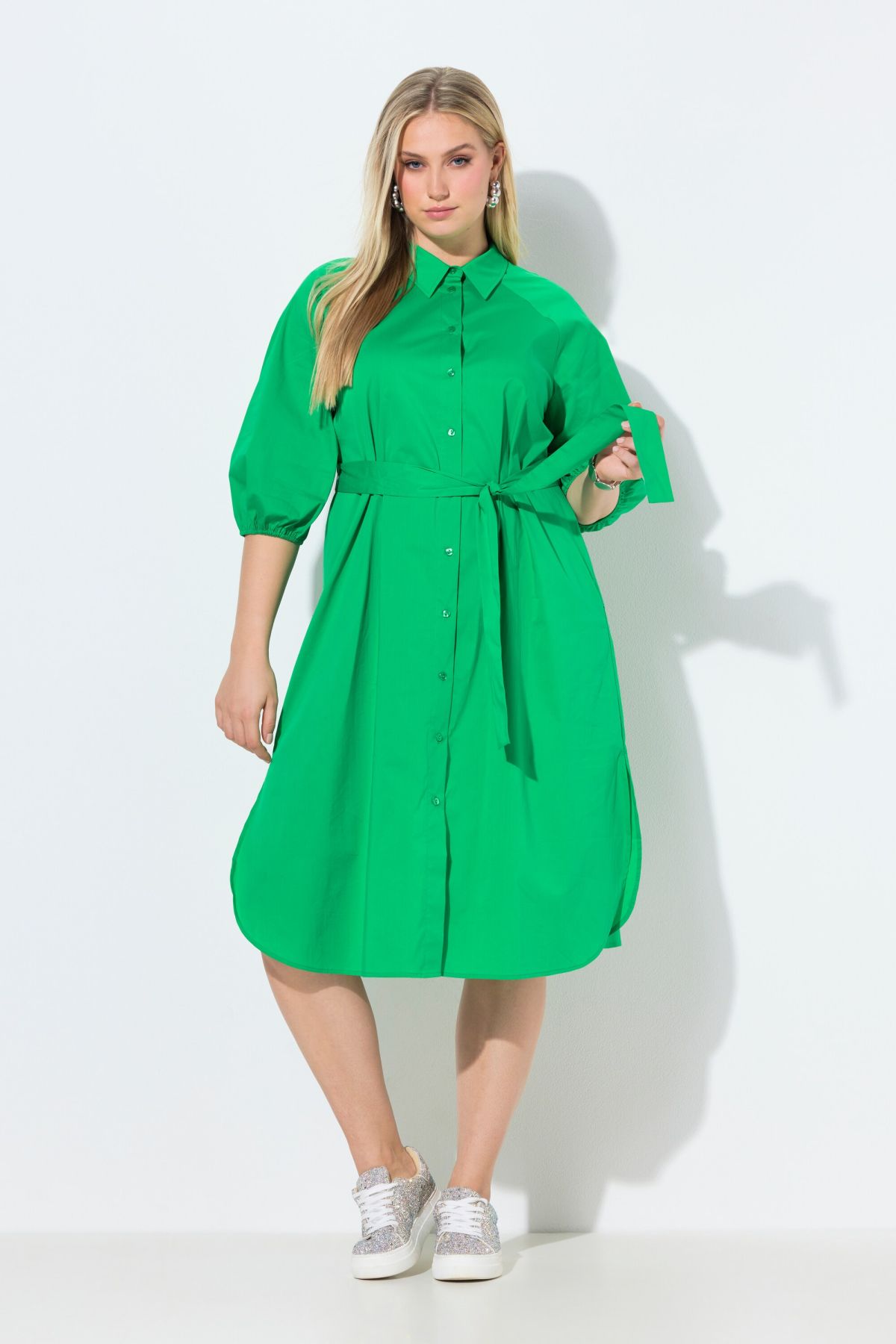 Едноцветна рокля с 3/4 балон ръкави с ластичен маншет. Яка на риза, предно закопчаване с копчета, заоблен подгъв с цепки, странични джобове в шева, подвижен колан. Елегантна кройка с А-силует от мека памучна смес.