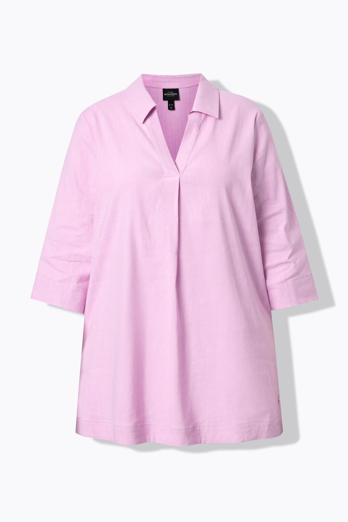 Ленена туника с А - линия на силуета. С класическа яка на риза с V - образно деколте и декоративно плисе. С 3/4 ръкави и заоблен подгъв със странични цепки
