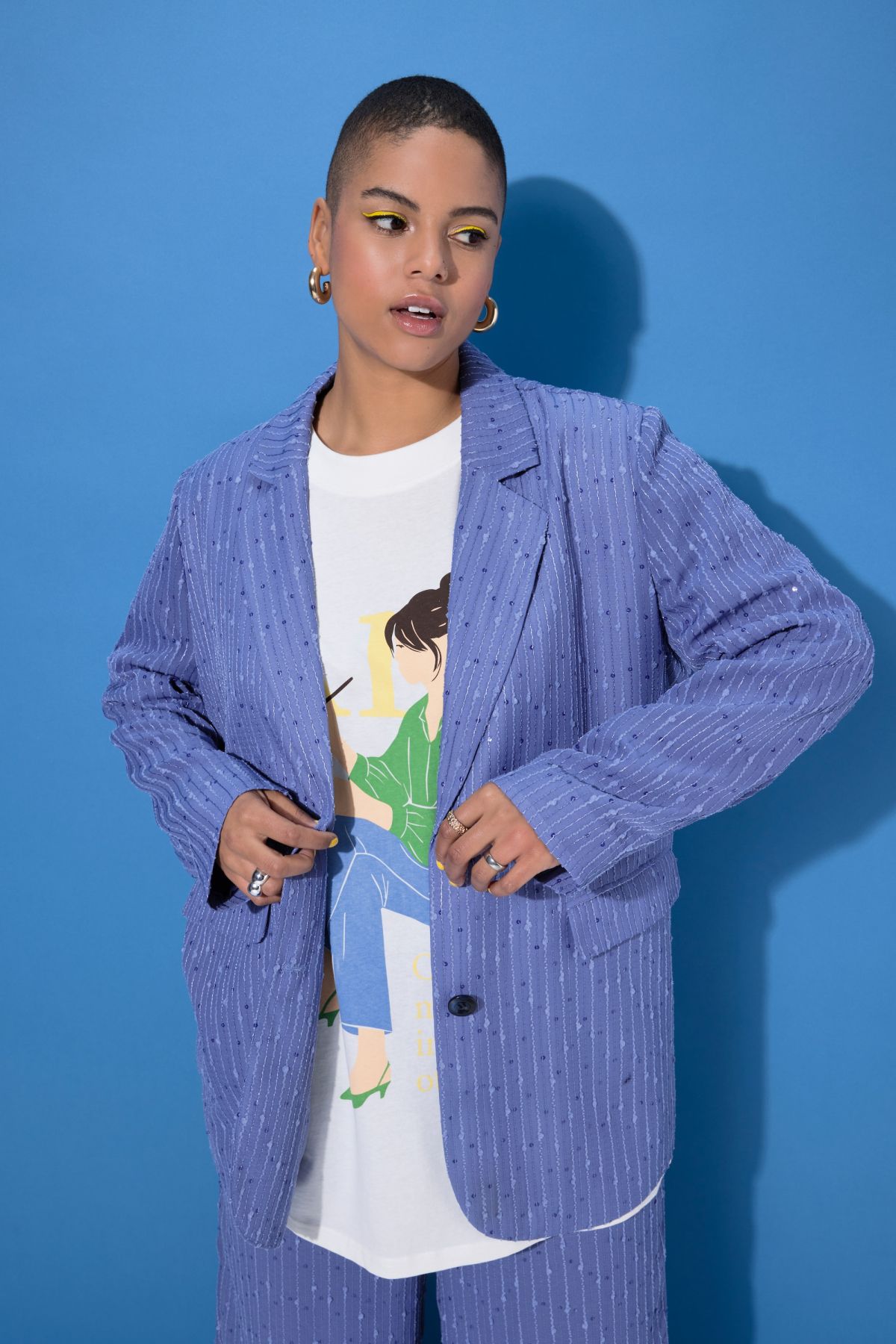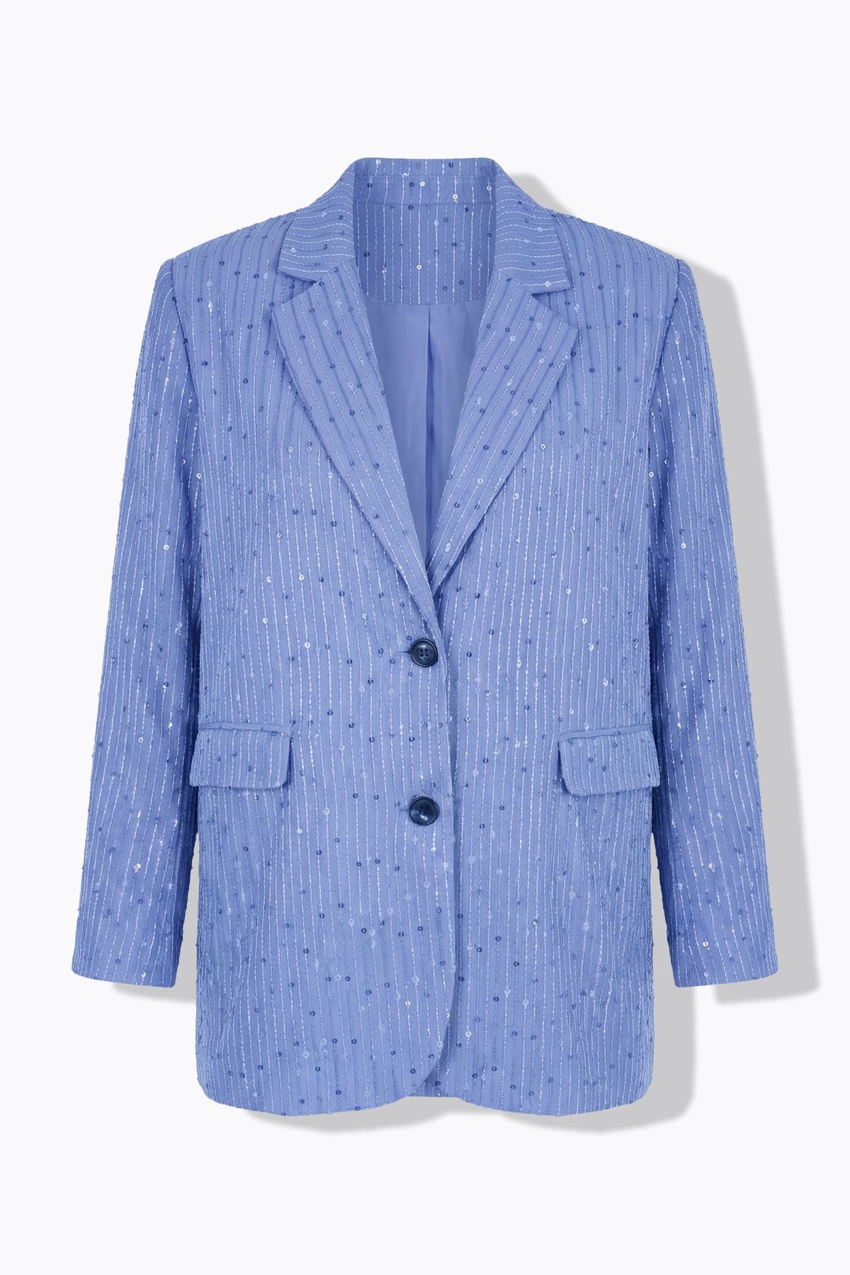 Блейзър с раиран принт и пайети. С яка с ревери, копчета отпред и странични джобове с капаци. Модел с дълги ръкави. Стилно за ежедневието.