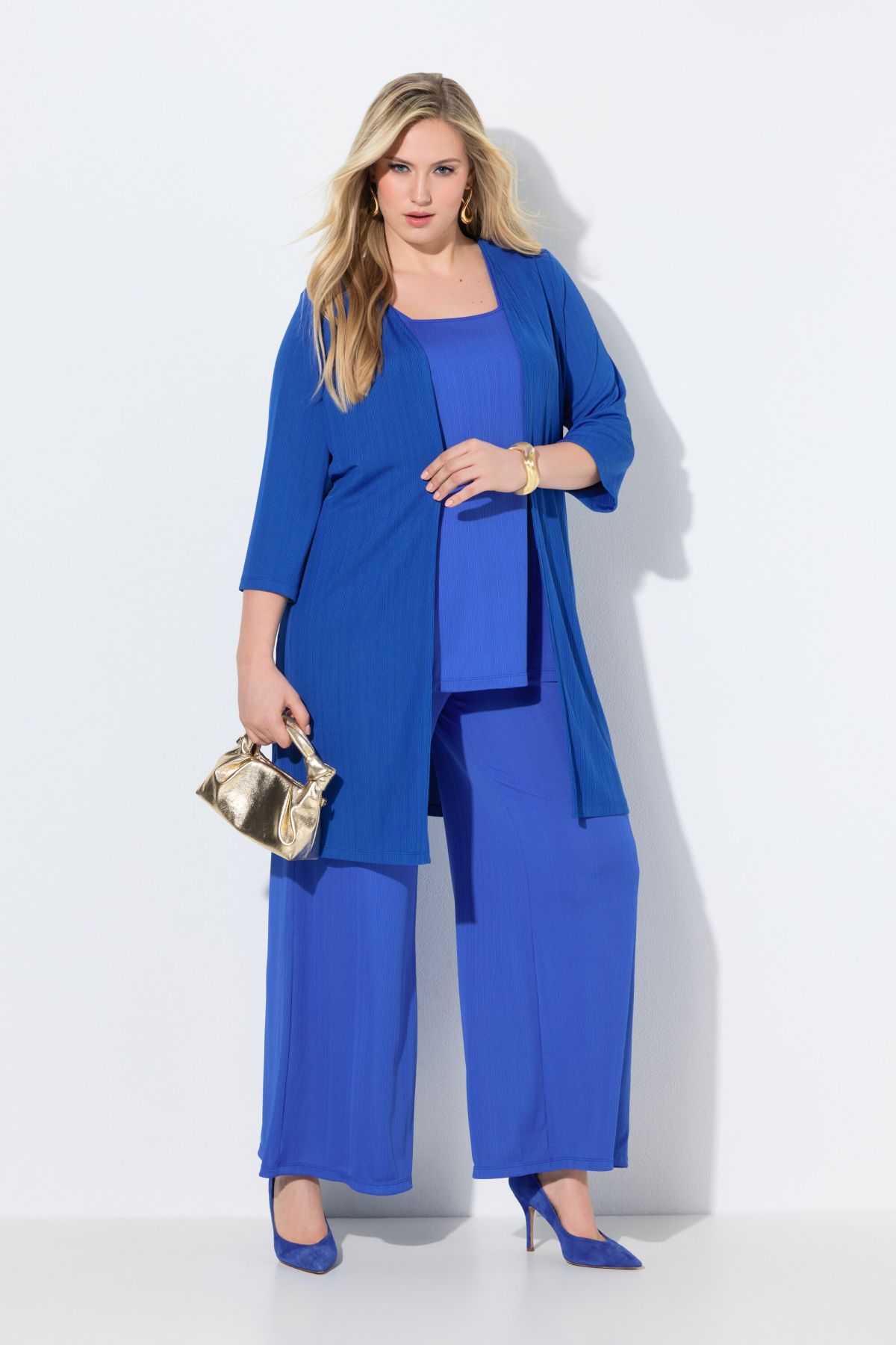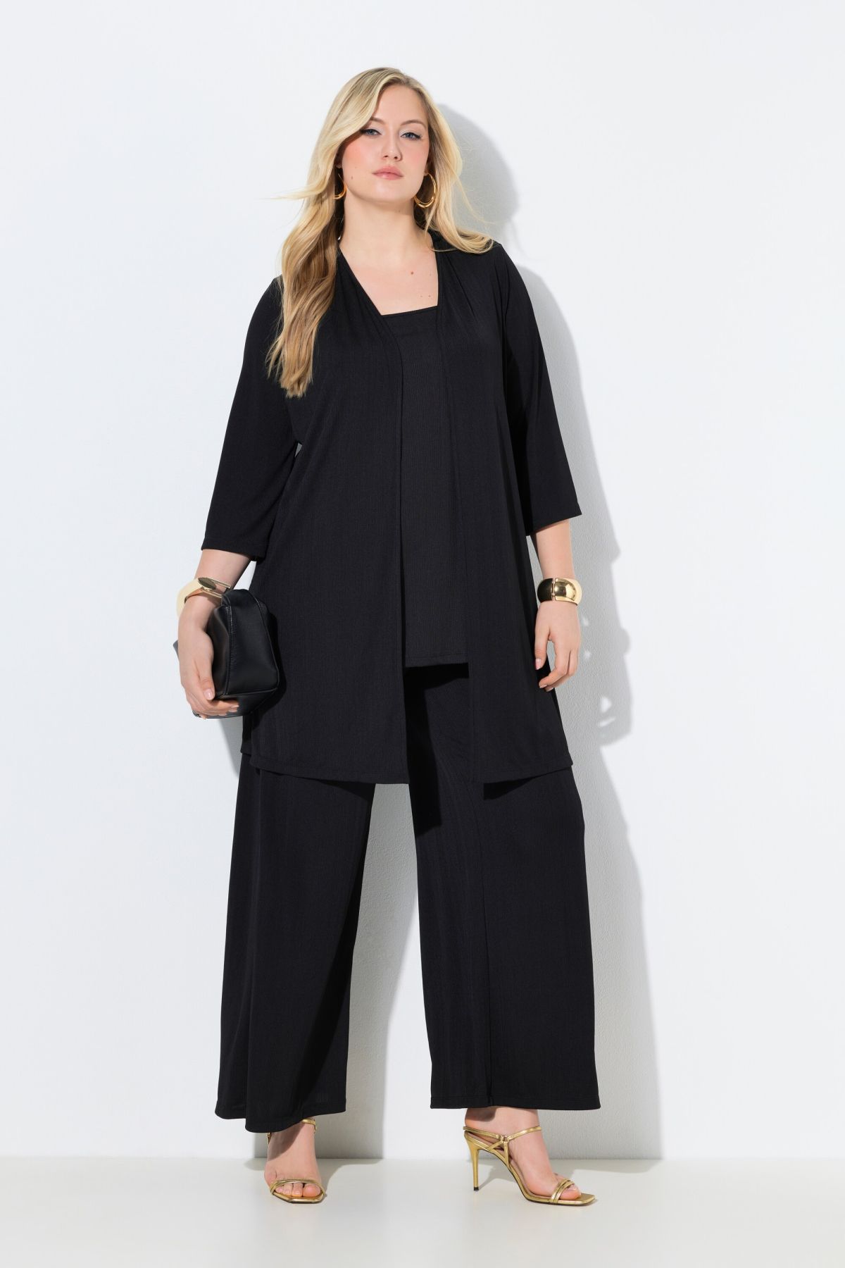 Дълга, трикотажна жилетка - перфектно се съчетава с всеки силует. С 3/4 ръкави, отворена отпред.