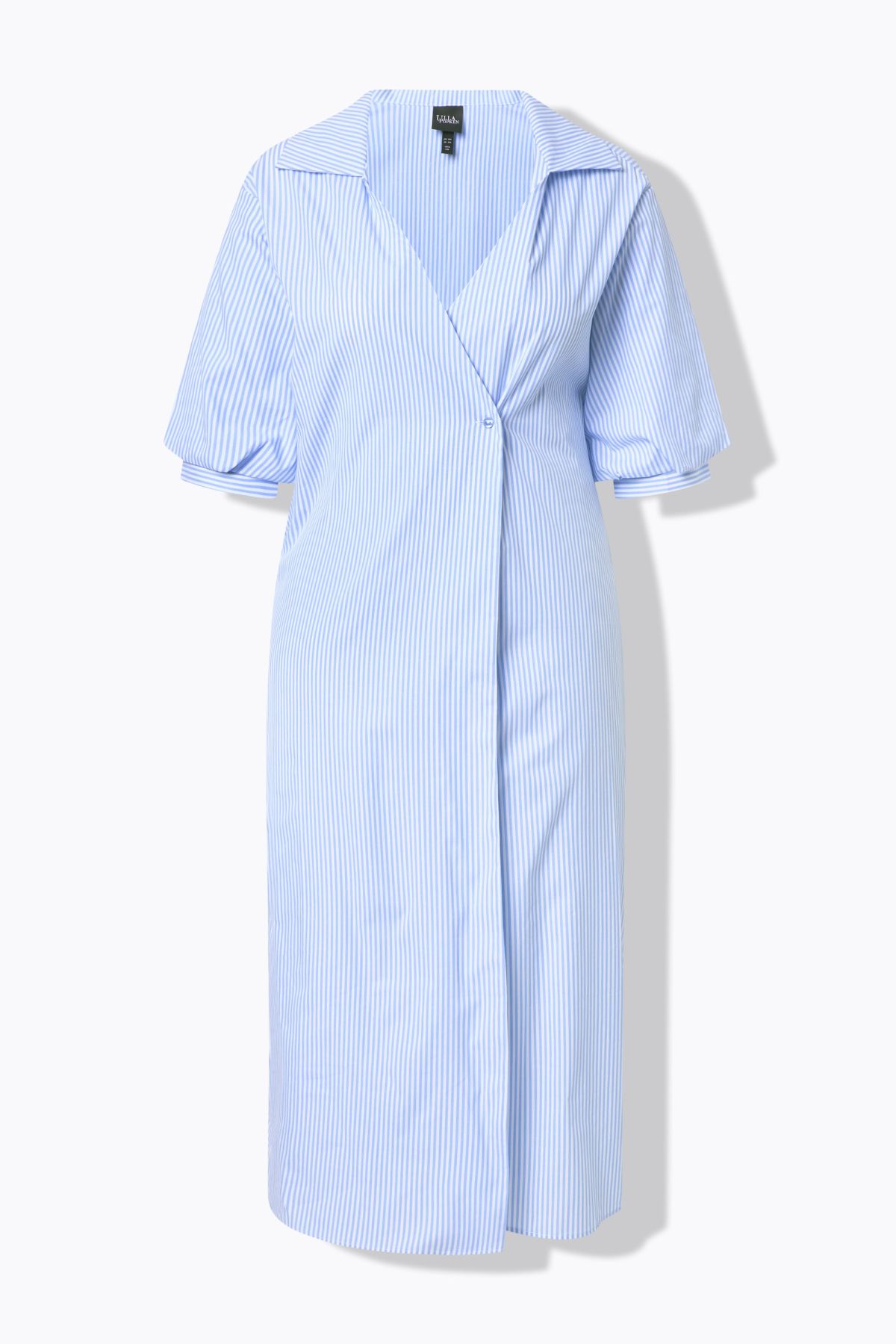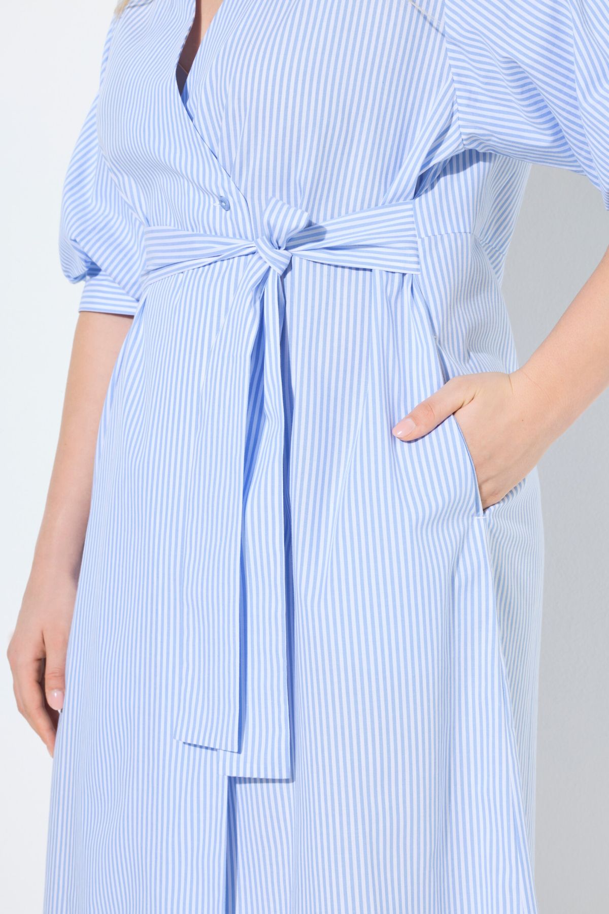 Рокля с райета с визия тип прегърни ме. С асиметрични акценти и широк колан на талията. С А - линия на силуета и модерни къси ръкави.