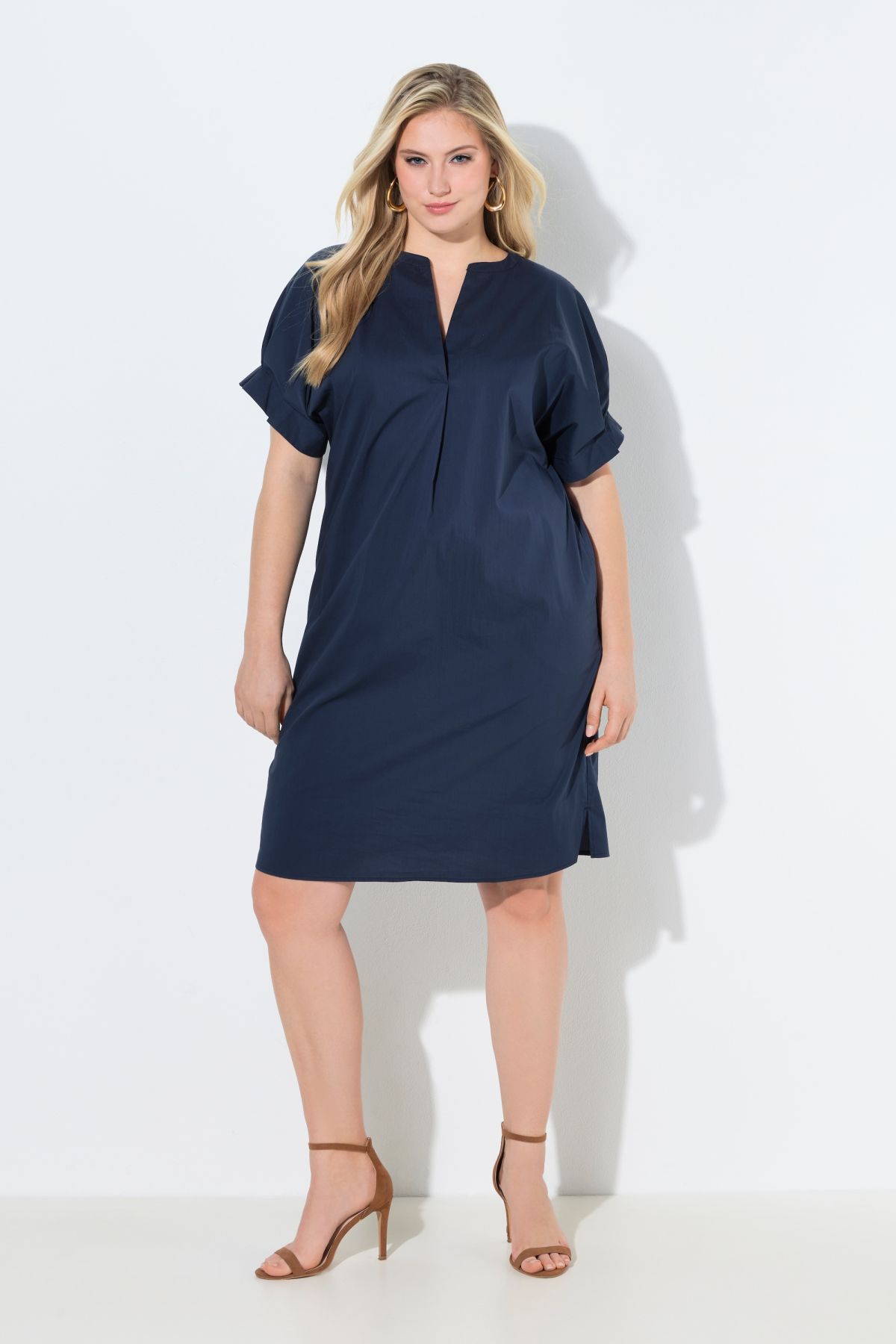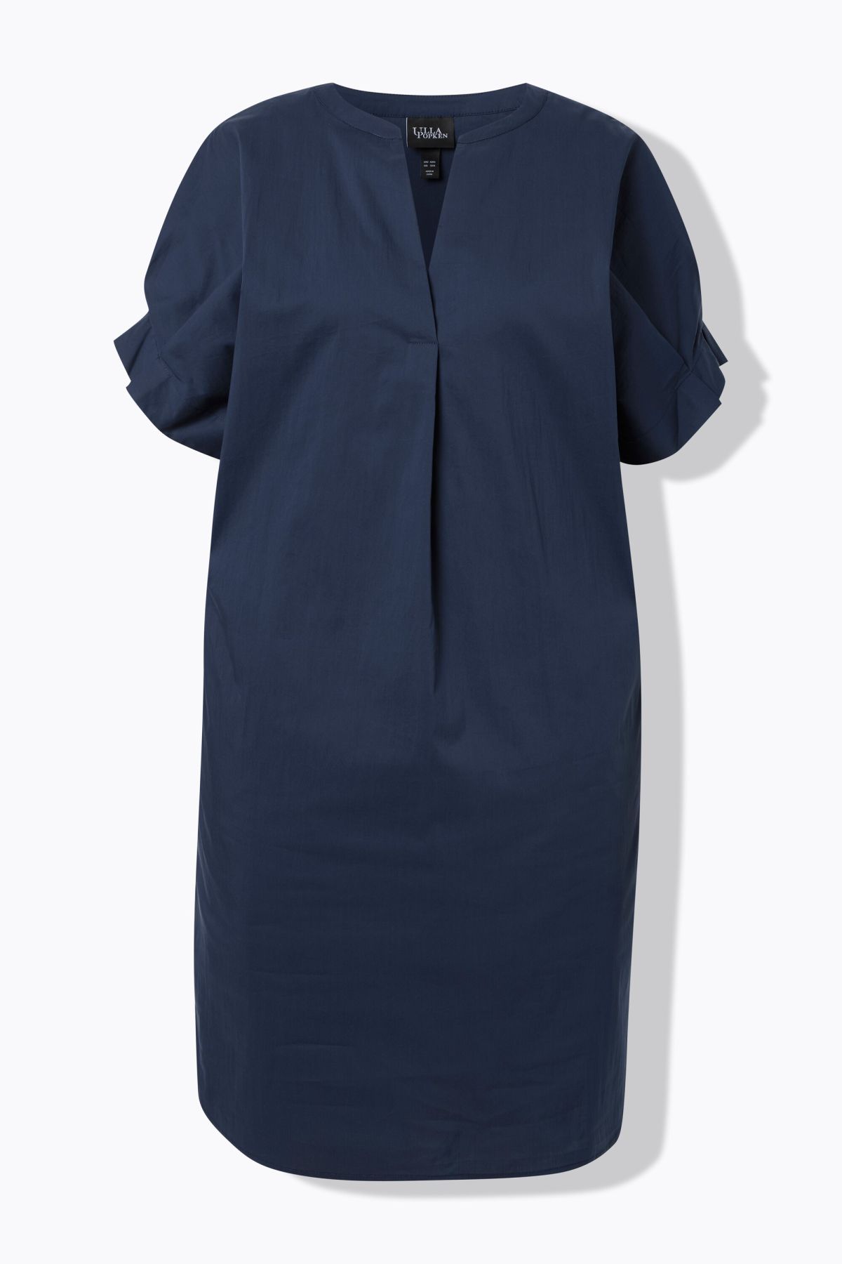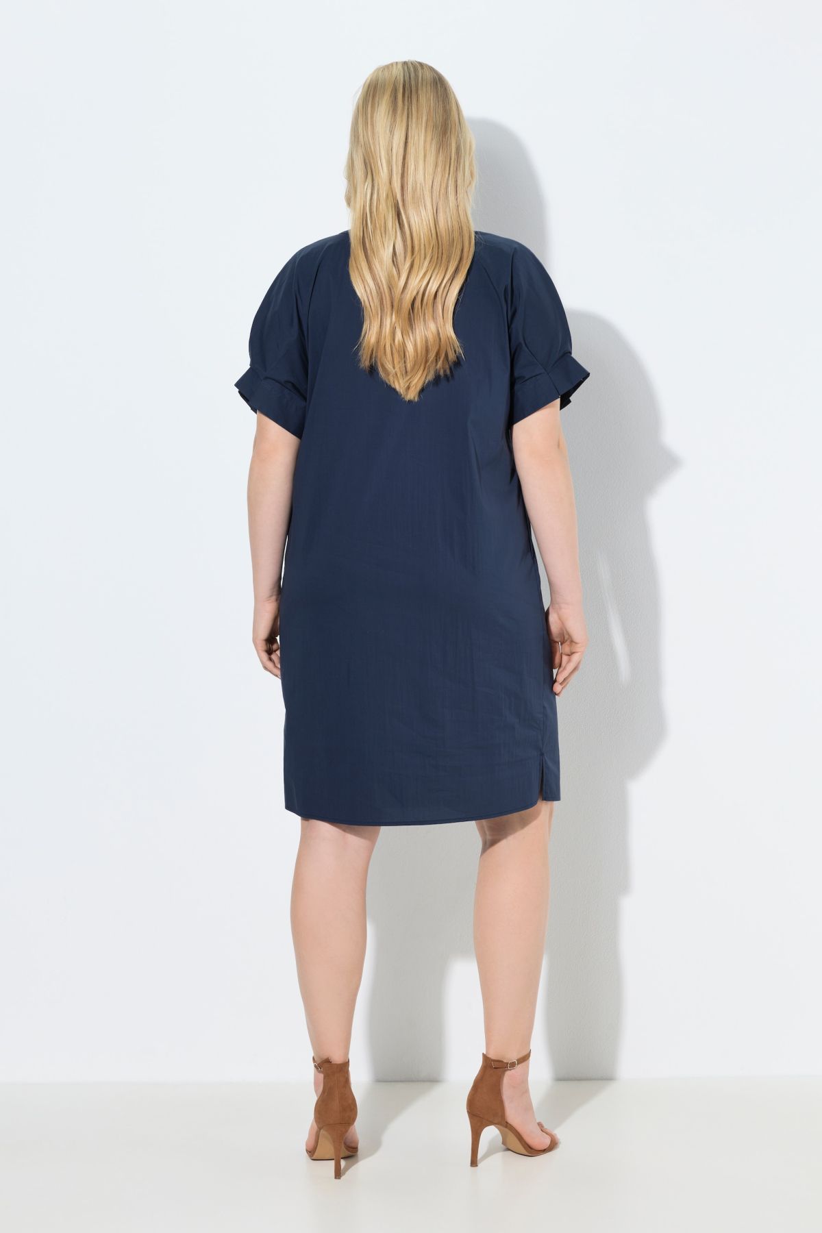 Едноцветна рокля от висококачествена материя. С изправена яка с V - образно деколте и къси ръкави тип балон с еластичен маншет. С А - линия на силуета и перфектна дължина.