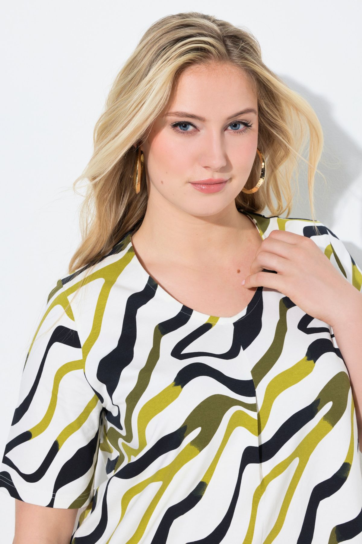 Тениска с принт на вълни в земни тонове. С V - образно деколте с плисе и къси ръкави. От мека, комфортна материя.