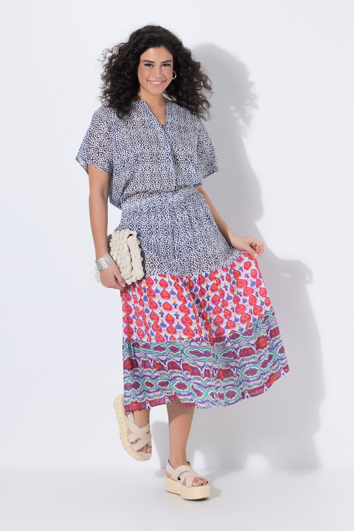 Пола с микс от принтове с еластична талия. Деликатна и лека. Лесна за носене и съчетание.