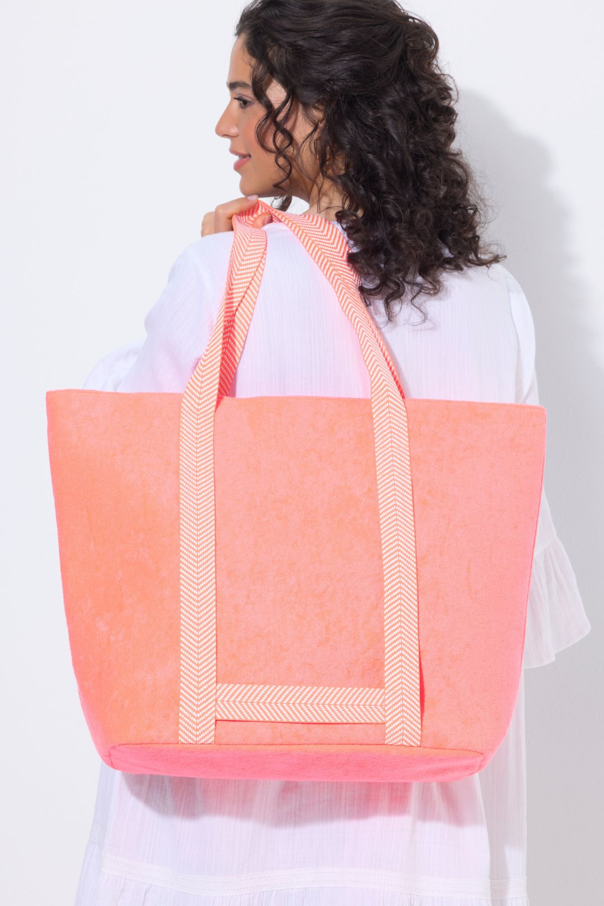 Чанта с декоративни презрамки в неоново розов цвят. С цип за закопчаване. Перфектна за разходка или плаж.
